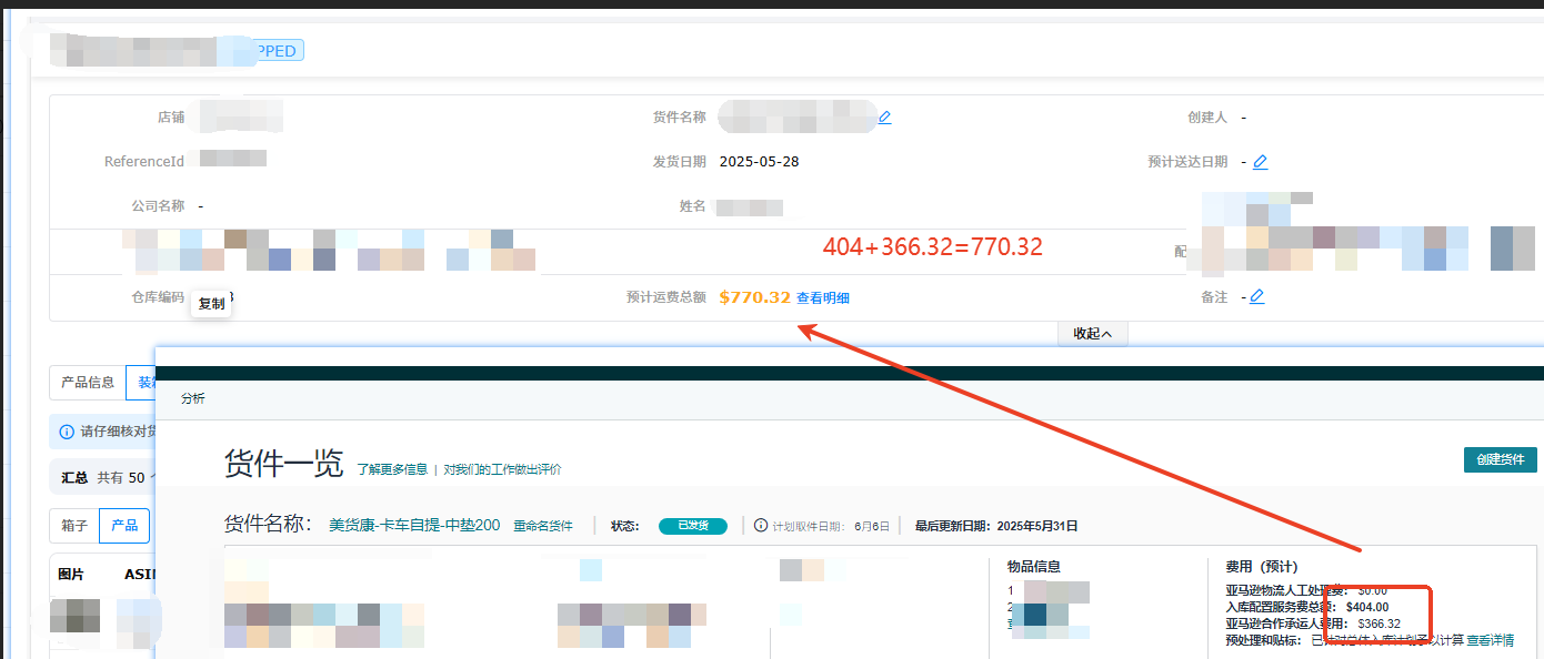 选择预计发货日期、货件发货信息,支持查看费用明细,确认后点击接受费用并创建货件可进入下一步。(确认发货之前支持重新装箱)
