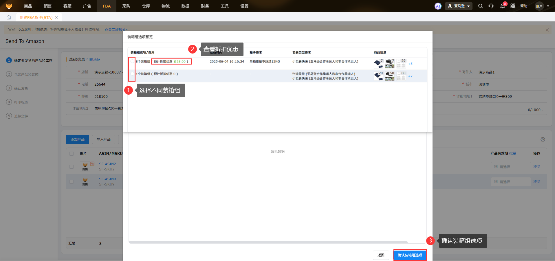 A5:当选择优惠装箱时,只能按照亚马逊要求的装箱组装箱,原厂包装表示每一箱都只能装一种SKU,会存在装不满的情况,对于这种情况系统会进行取整,就导致实际装箱数量与申报量不一致的情况,需要选择使用混装发货的方式,上传装箱资料。