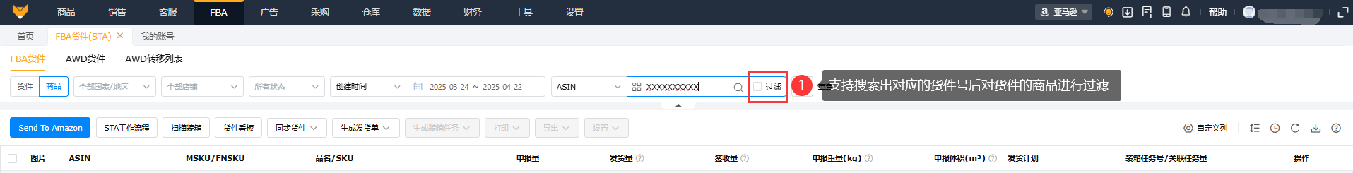 (2)可以进行二次过滤搜索,先搜索货件号,当货件下包含多个ASIN时可以再搜索ASIN,点击过滤搜索指定ASIN