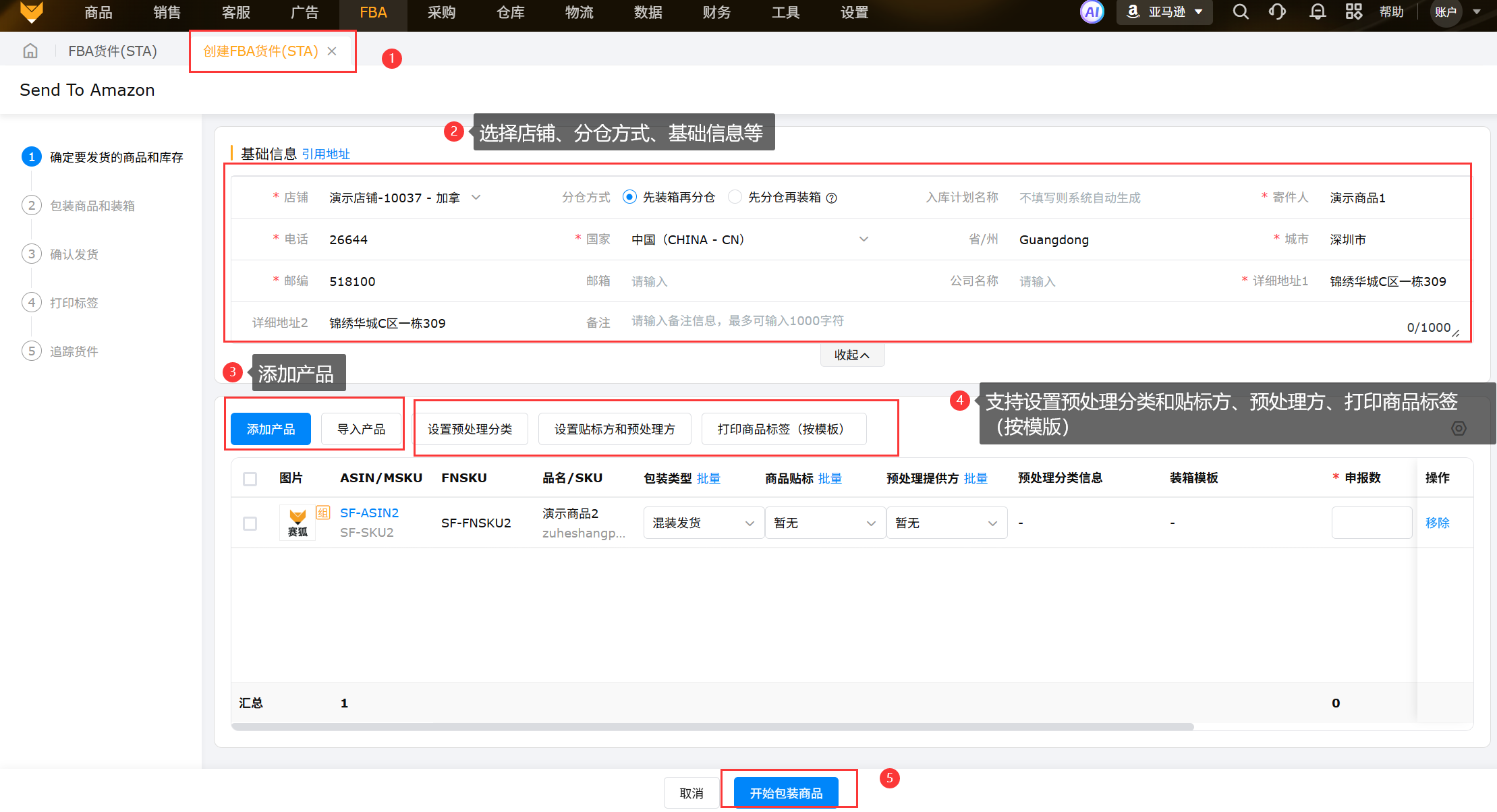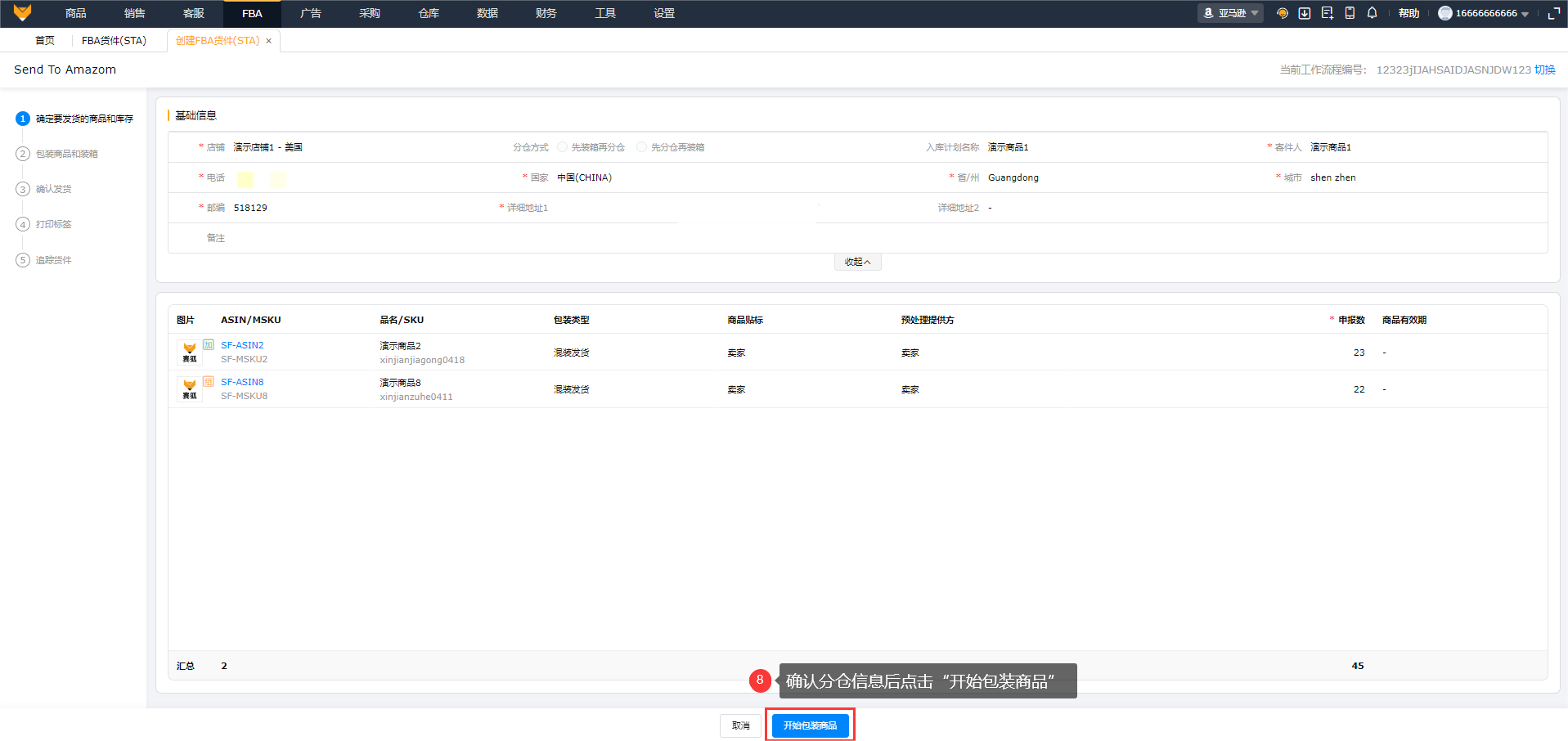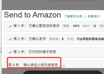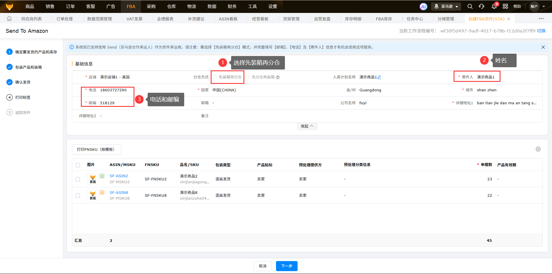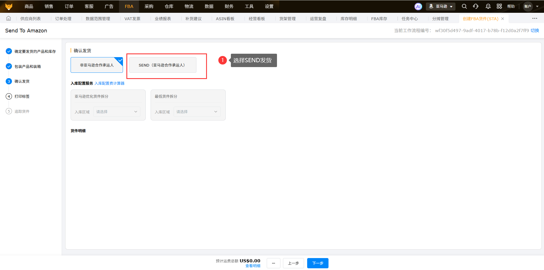 ①在第一步确定发货的商品和库存时要选择先装箱再分仓,并且货件必须是中国发往美国的货件,在基础信息中须完善电话、邮编和姓名才可能使用SEND发货
