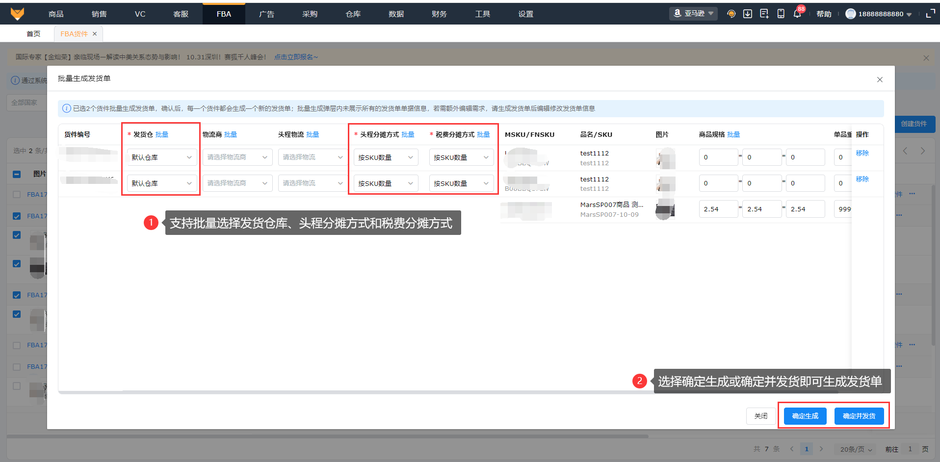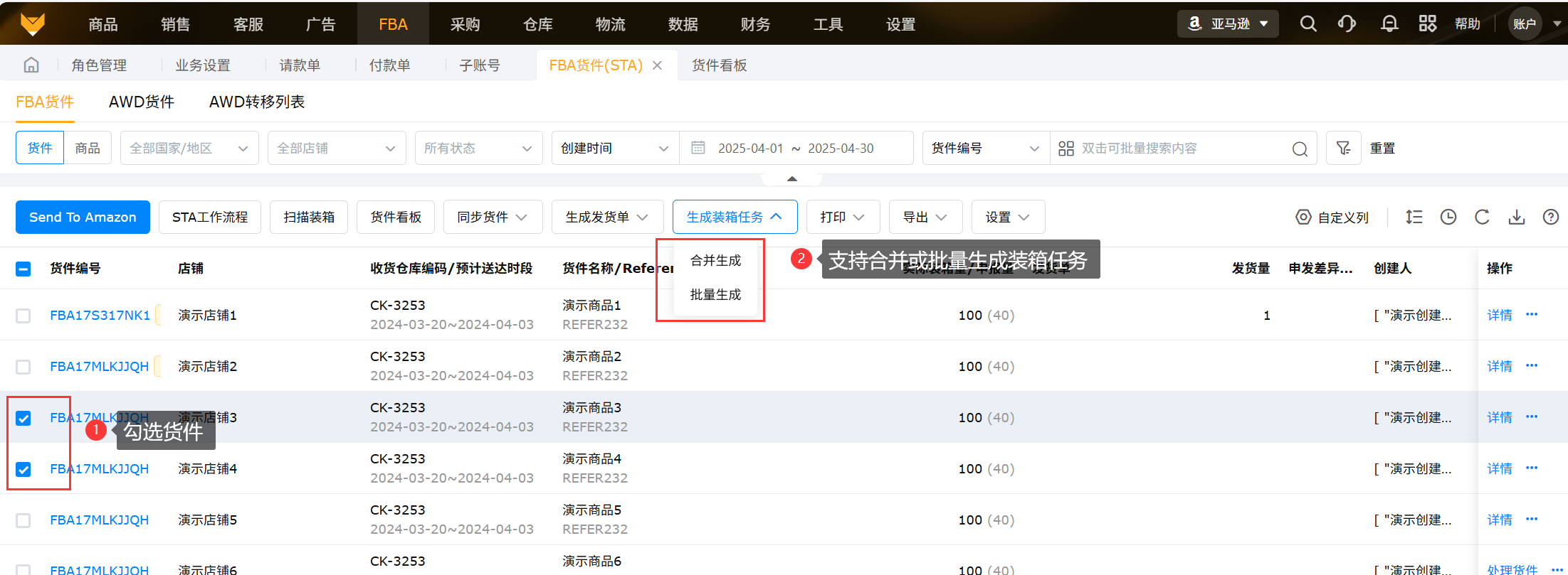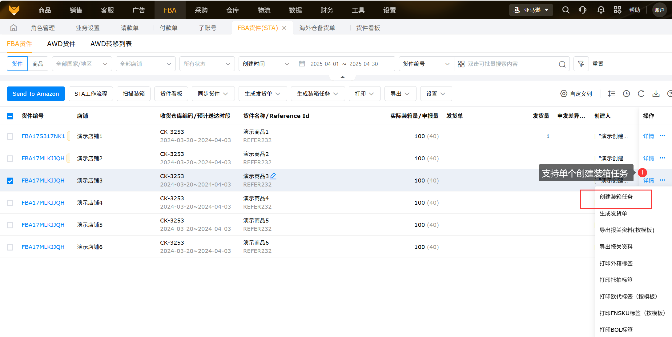 支持单个、多个货件生成装箱任务,可以选择批量生成,也可以选择合并生成,注意合并生成必须是相同店铺和站点。