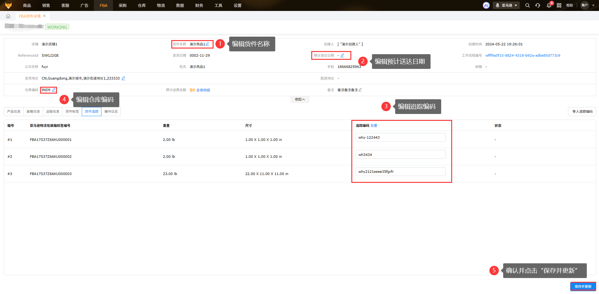 支持更新追踪编码:状态为DELIVERED、RECEIVING、CHECHED IN的货件不支持更新追踪编码。