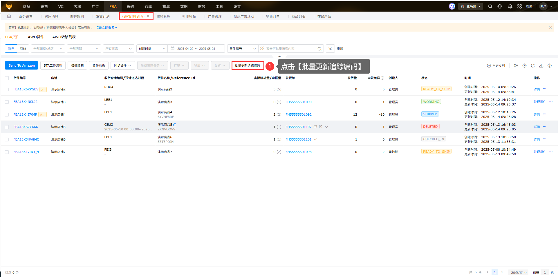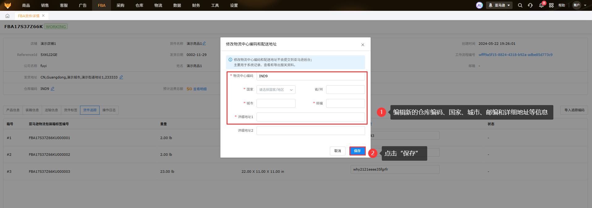支持修改仓库编码:目前部分仓库由于亚马逊接口未及时更新仓库代码信息,可能出现仓库和亚马逊后台的货件仓库不一致,不是实际入仓地址的情况,针对这种情况,系统FBA货件页面支持编辑修改仓库编码,修改成正确的仓库展示,系统修改只影响系统中的仓库展示,不会影响亚马逊后台的货件数据