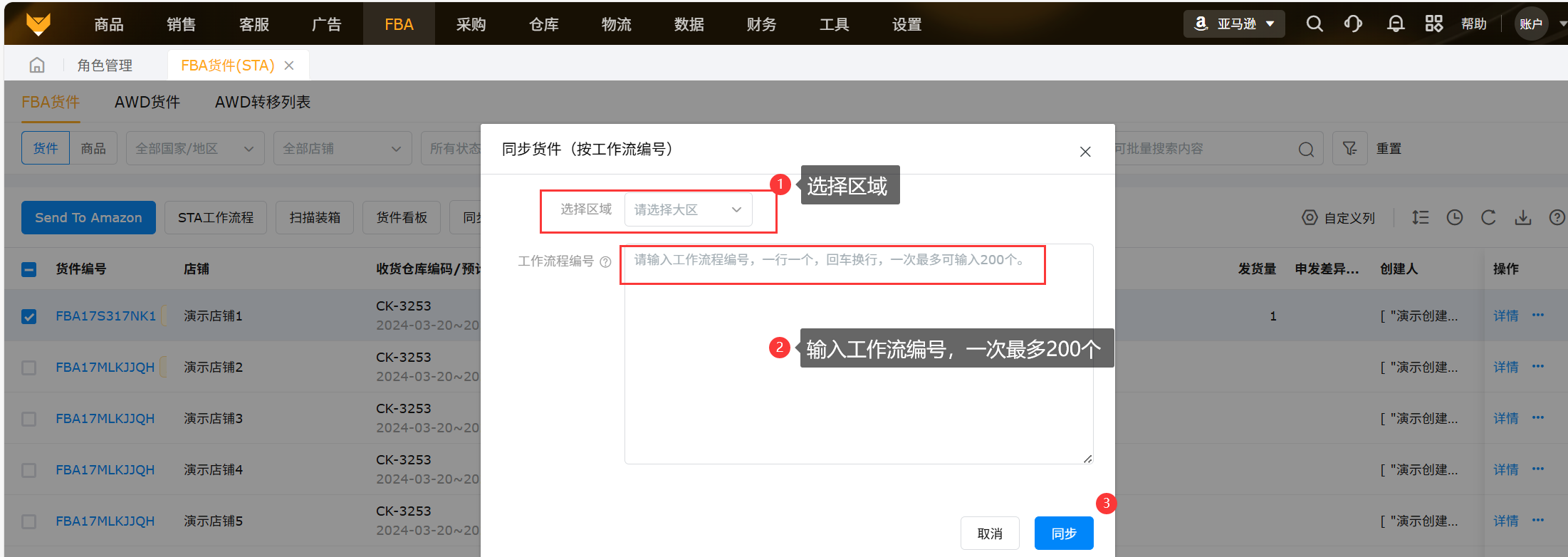 支持手动同步亚马逊后台创建的货件,需填写工作流程编号(指STA工作流编号,一般在【亚马逊后台 > Send To Amazon】页面左下角,38位字符长度的编码)。一次最多可输入200个。