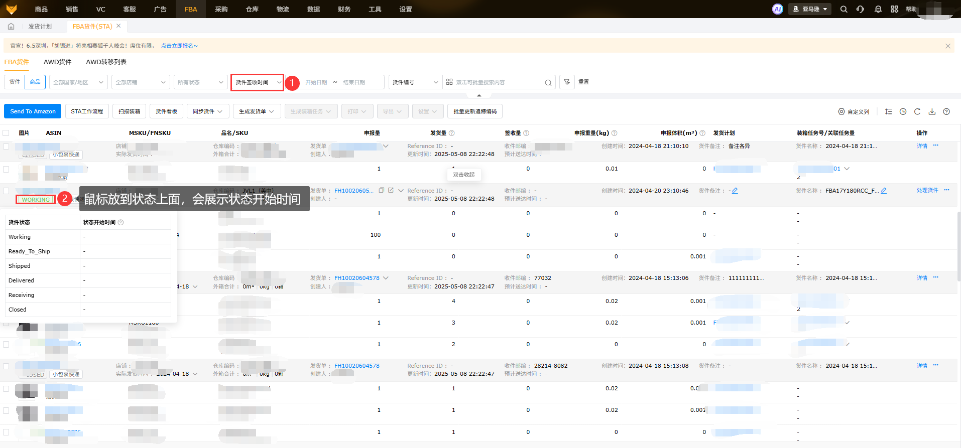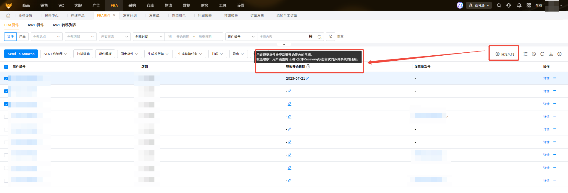 STA货件列表中,鼠标放到状态标签上面时,会显示状态以及状态开始时间;自定义列表可以选择“签收开始日期”,优先以手动设置的为准,没有手动设置时会默认取Receving状态首次出现在系统的日期。