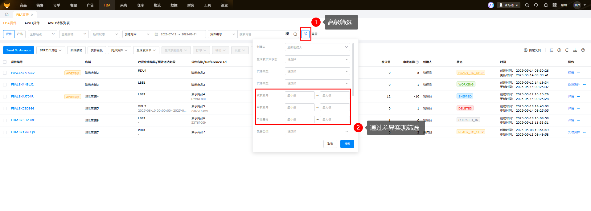 (5)高级筛选通过申收差异、收发差异、申发差异,查询货件