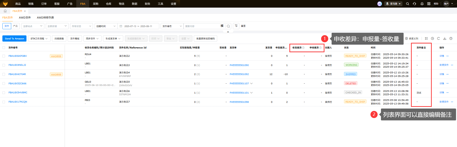 可以通过自定义列设置,货件界面查看申收差异、收发差异、申发差异以及编辑货件备注