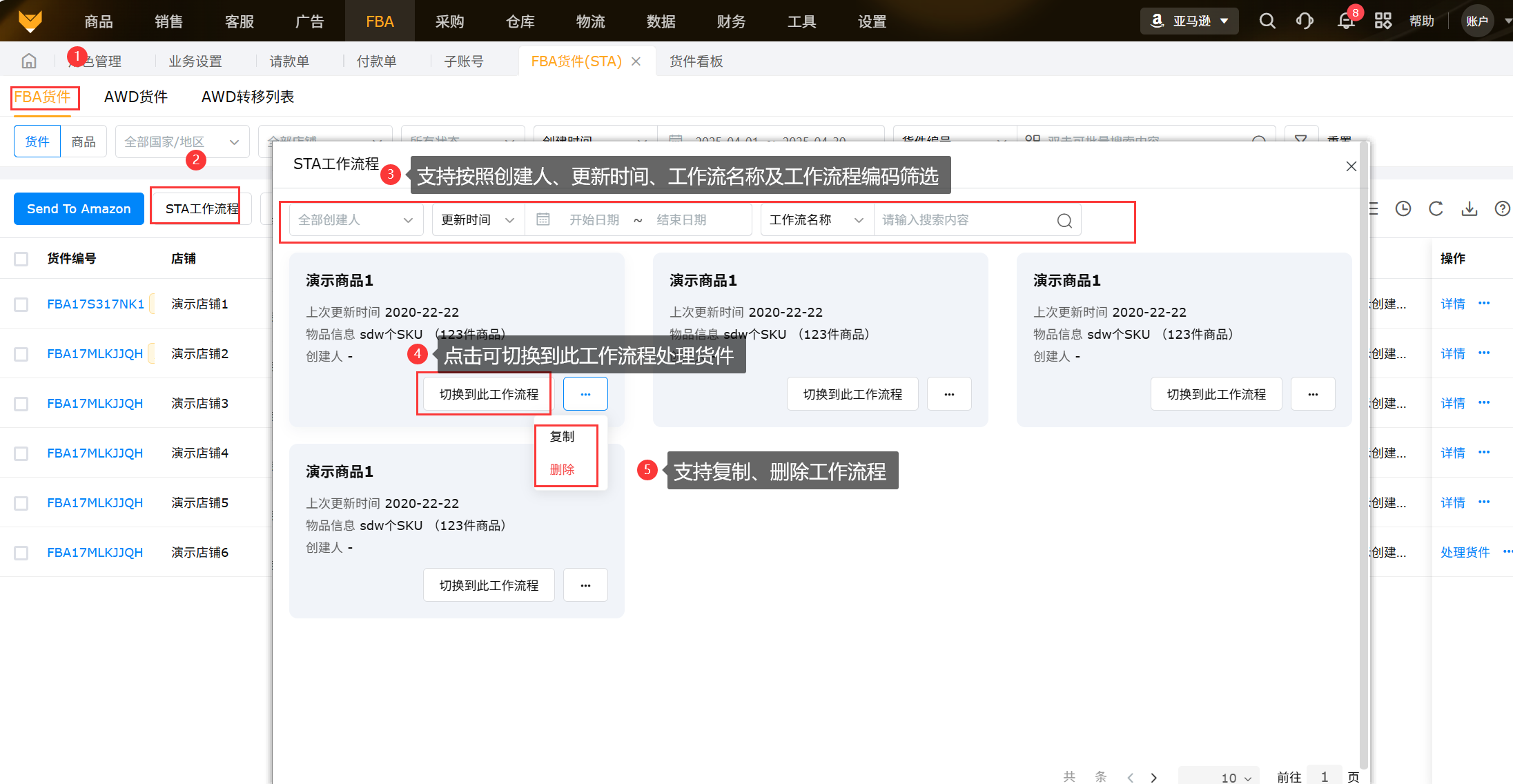 点击“STA工作流程列表”,可查看全部工作流程,可选择切换到对应工作流程中继续处理创建货件。
