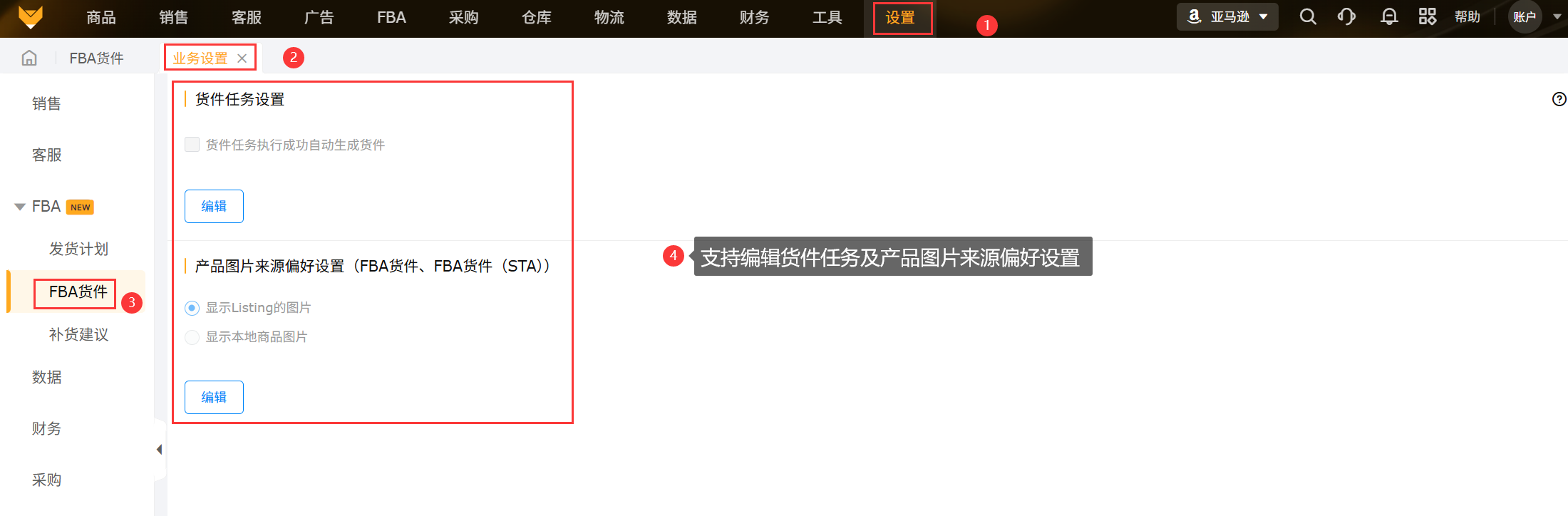 支持自定义设置货件产品图片来源,【设置-业务设置-FBA货件 -产品图片来源于Listing或者本地SKU(修改此处会影响FBA货件和FBA(STA)新版两个页面)】,便于用户按照自己的喜好区分产品;