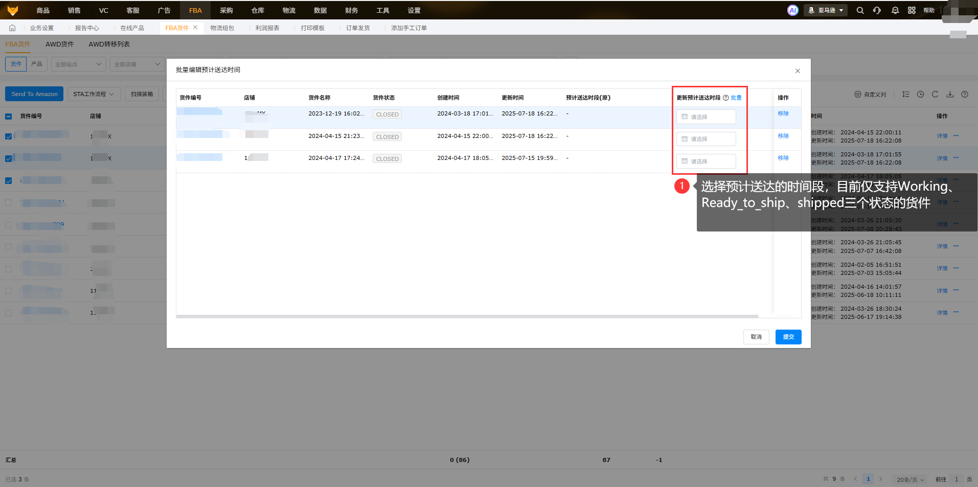 批量更新货件的预计送达时间,目前仅支持Working、Ready_to_ship、shipped状态的货件更新预计送达时间,可选择日期由接口返回的,更新失败的错误由接口返回。