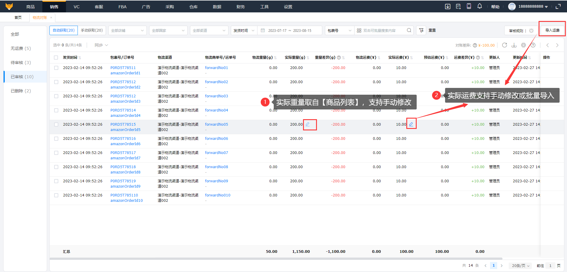 实际运费:初始会取“物流运费”的数据,如实际运费与接口返回数据不一致,支持手动修改也可批量导入;