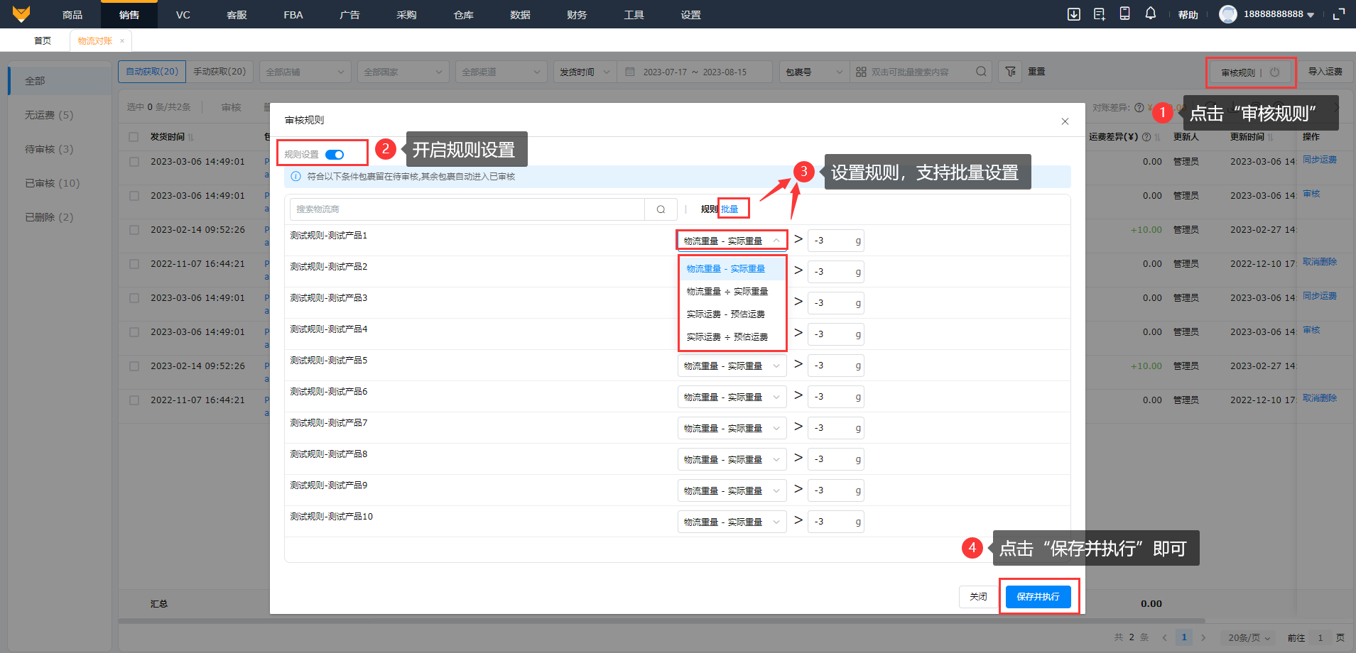对账差异:物流运费-实际运费。