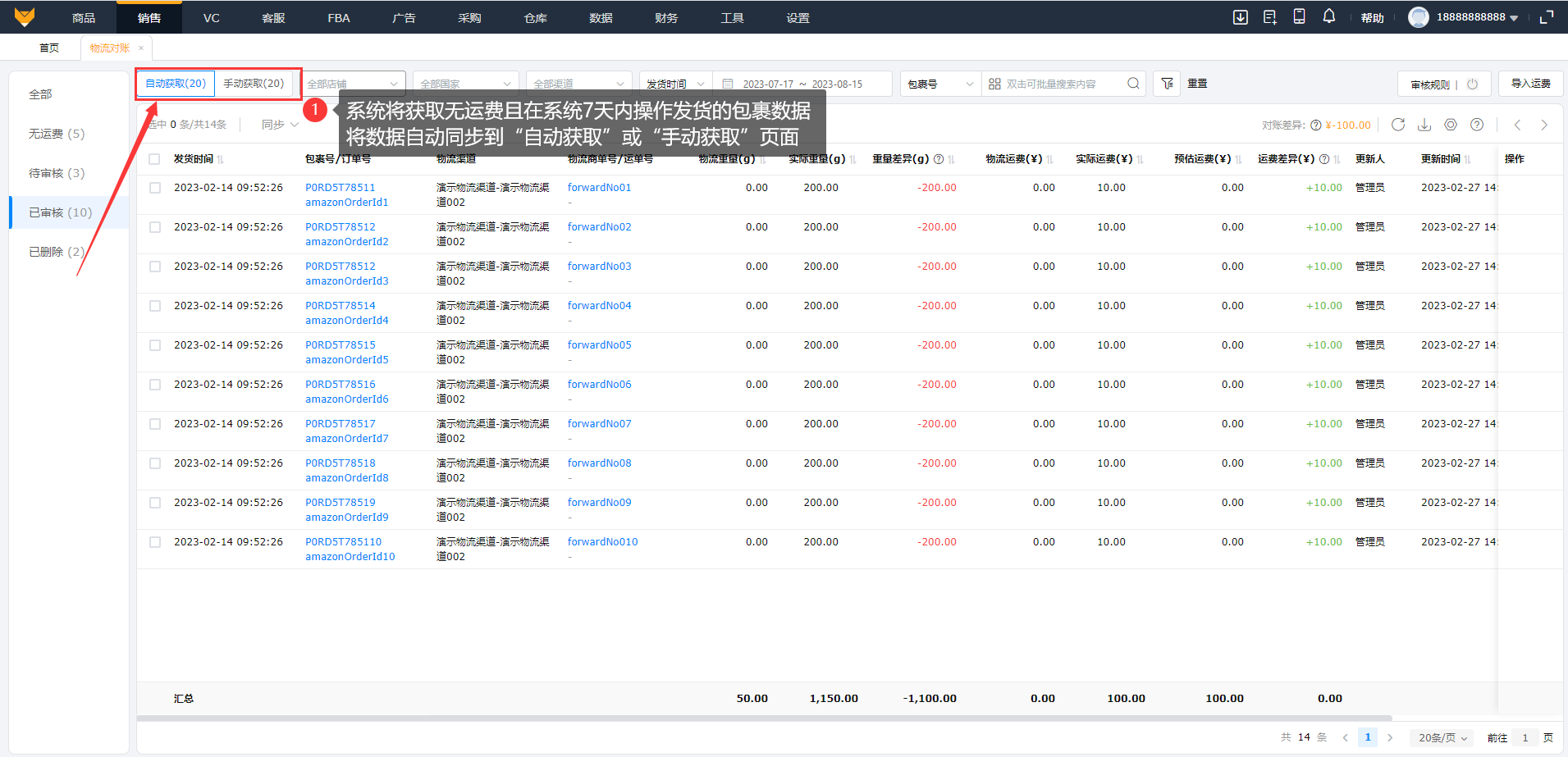系统将获取无运费且在系统7天内操作发货的包裹数据,将数据自动同步到“自动获取”或“手动获取”页面;