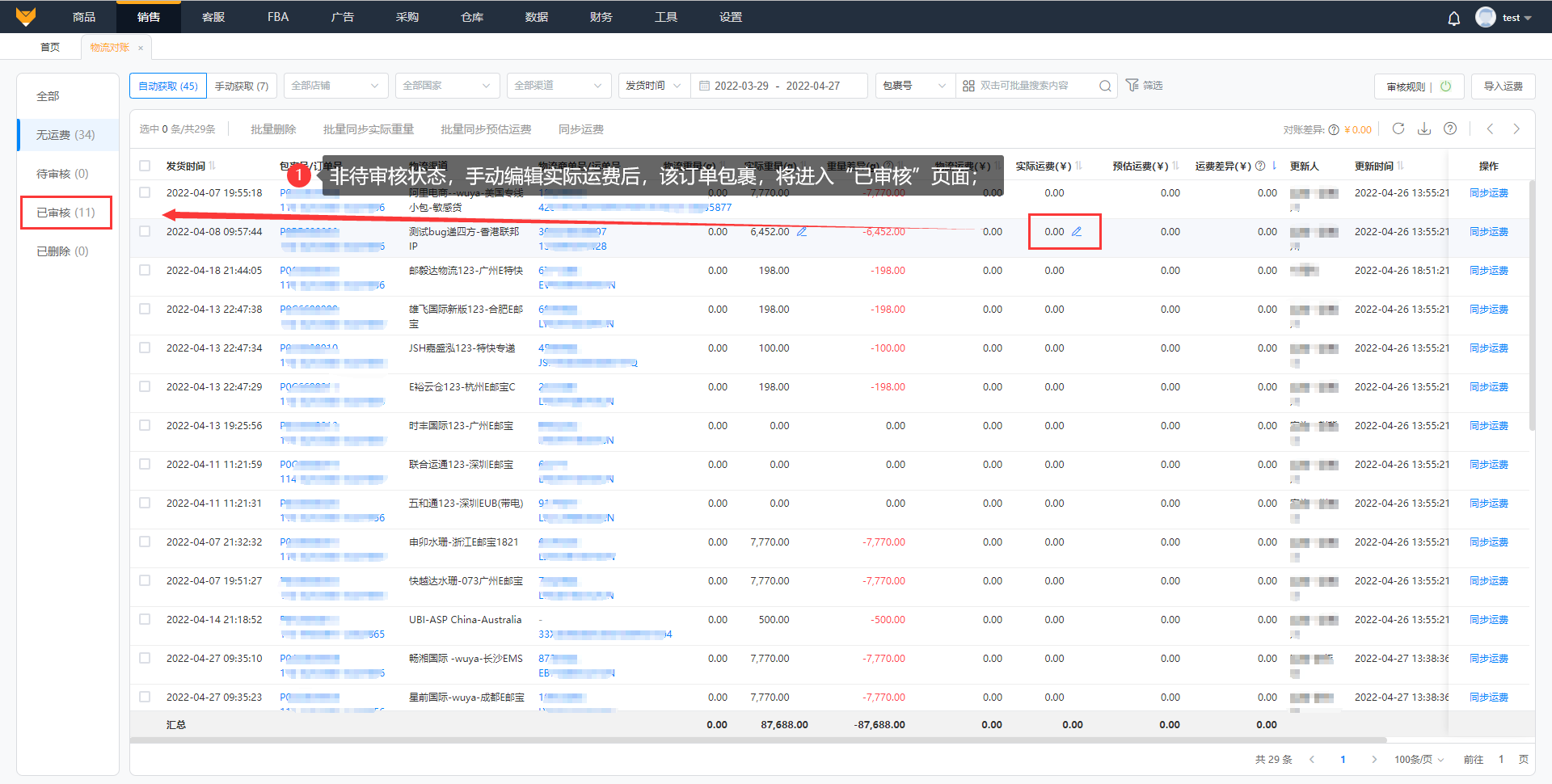 非待审核状态的订单包裹,手动编辑实际运费后,该订单包裹,将进入“已审核”页面。