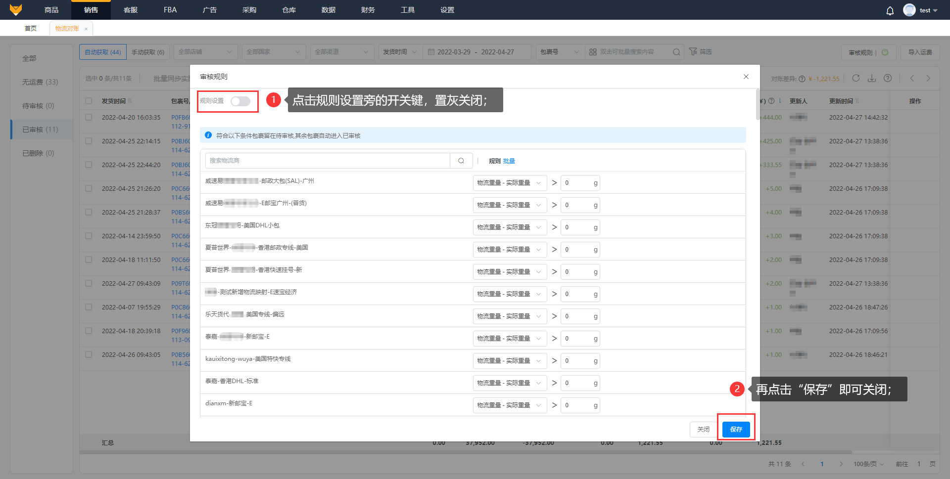 注意:规则里显示的物流是在【销售】>【物流设置】开启的物流和渠道;