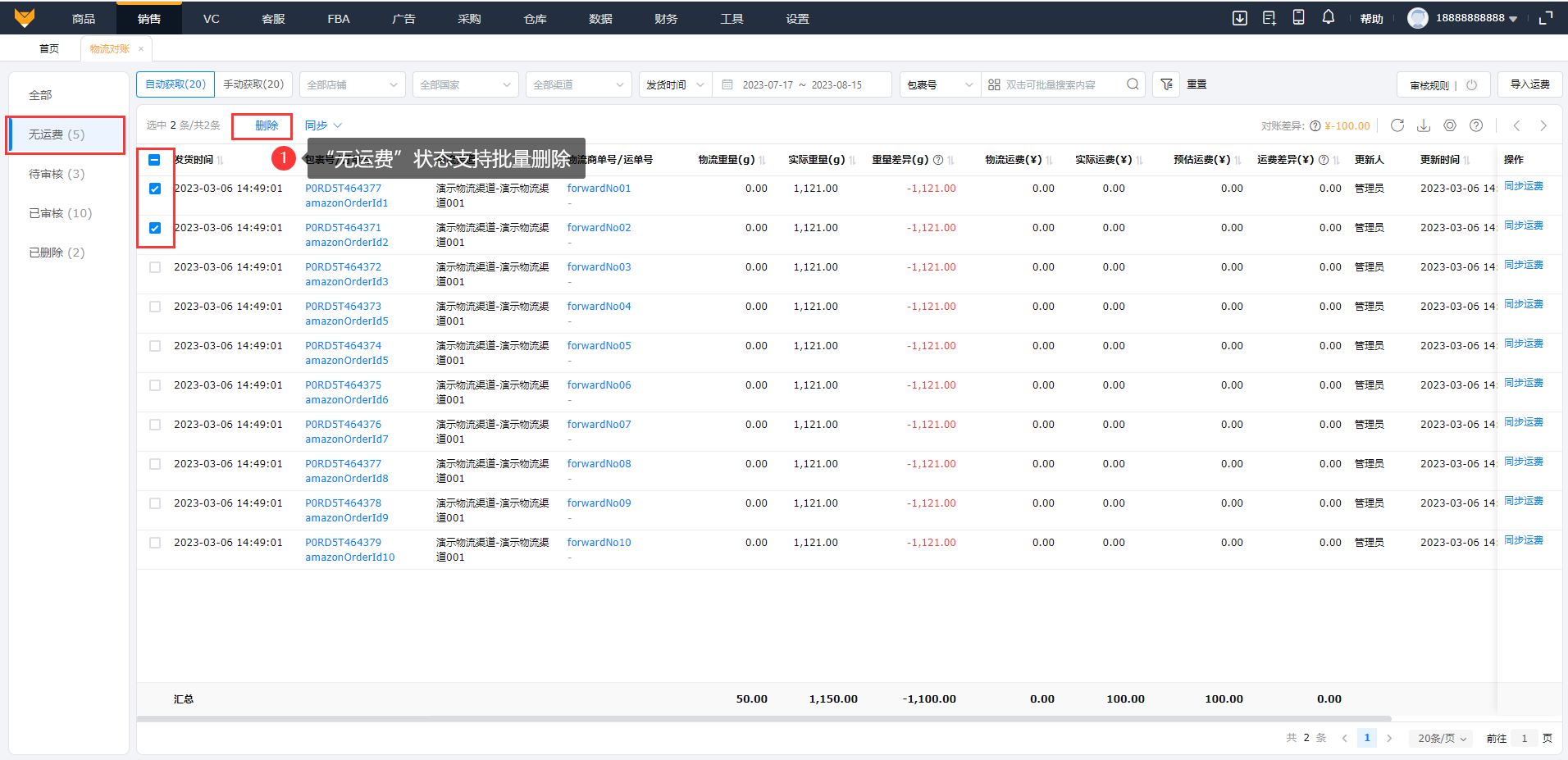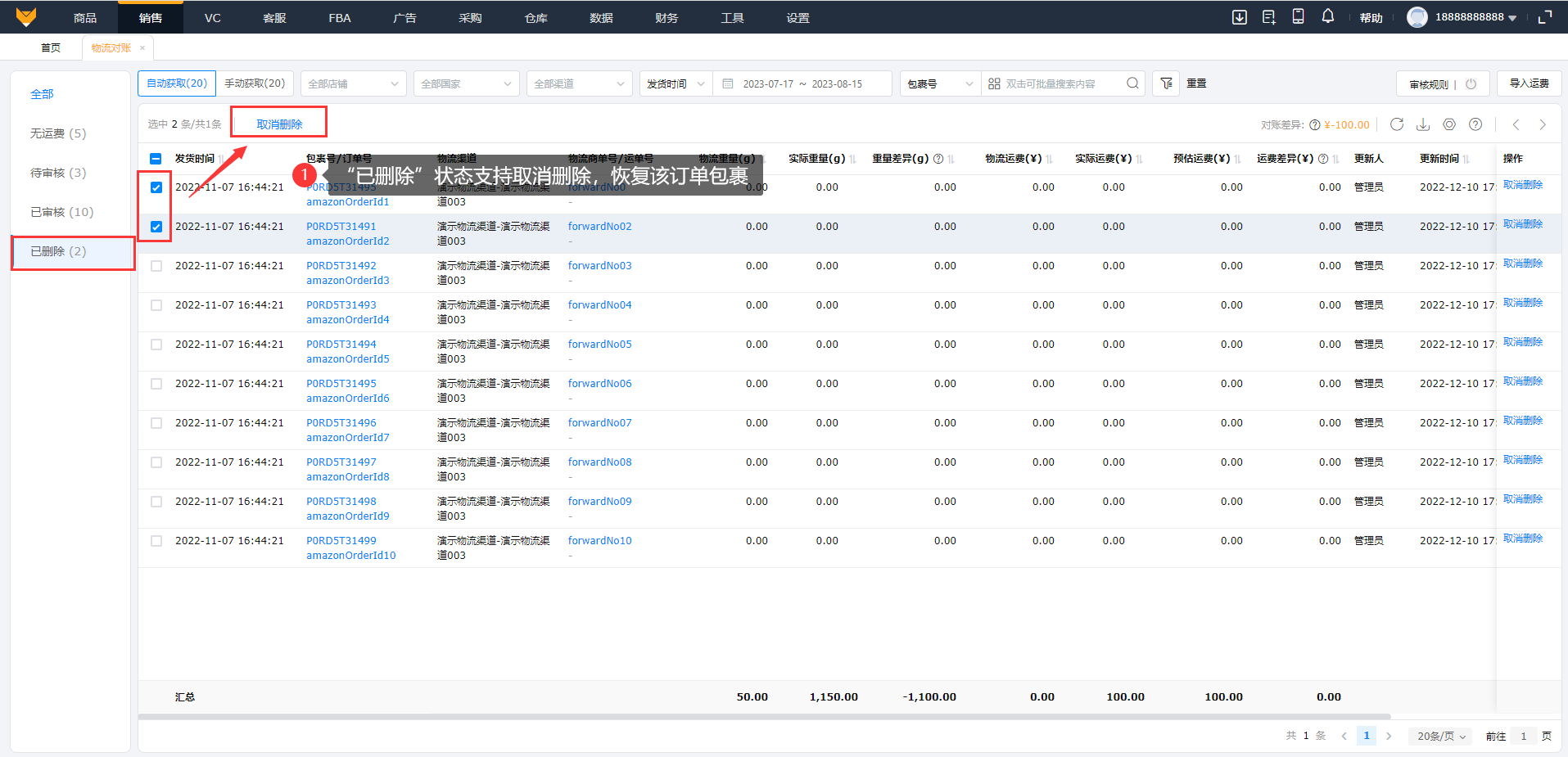 “无运费”状态支持批量删除,“已删除”状态支持取消删除,恢复该订单包裹。