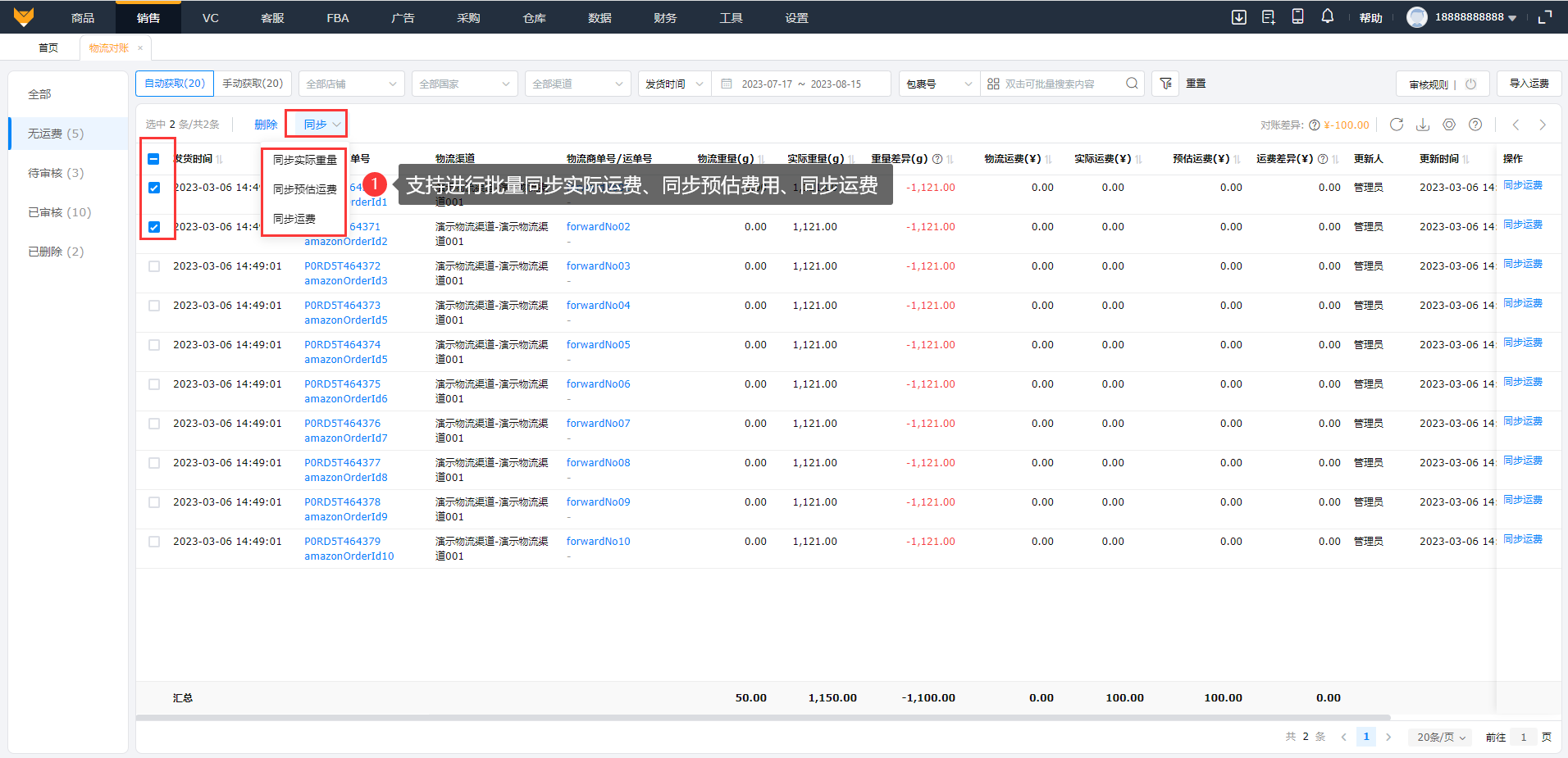 支持进行批量同步实际重量、批量同步预估运费、同步运费的操作;