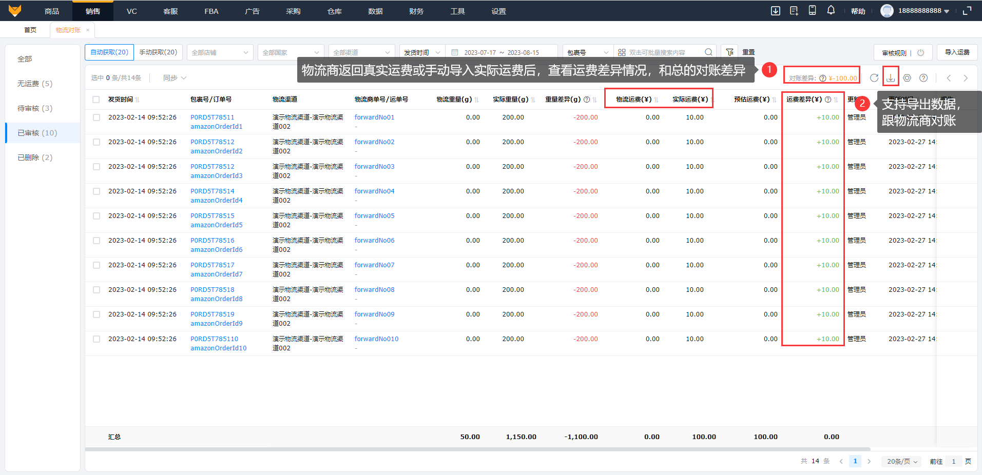 物流商返回真实运费,或手动导入实际运费后,查看运费差异情况,和总的对账差异;支持导出数据跟物流商对账。