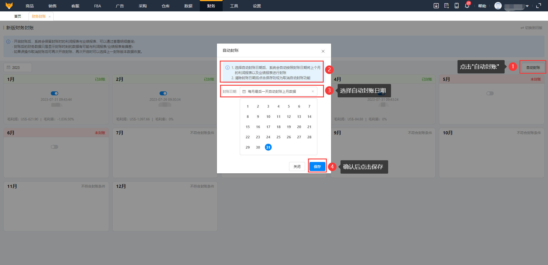 点击“自动封账”,选择自动封账日期后,系统会自动按照封账日期将上个月的利润报表以及业绩报表进行封账,封账人为“系统”。