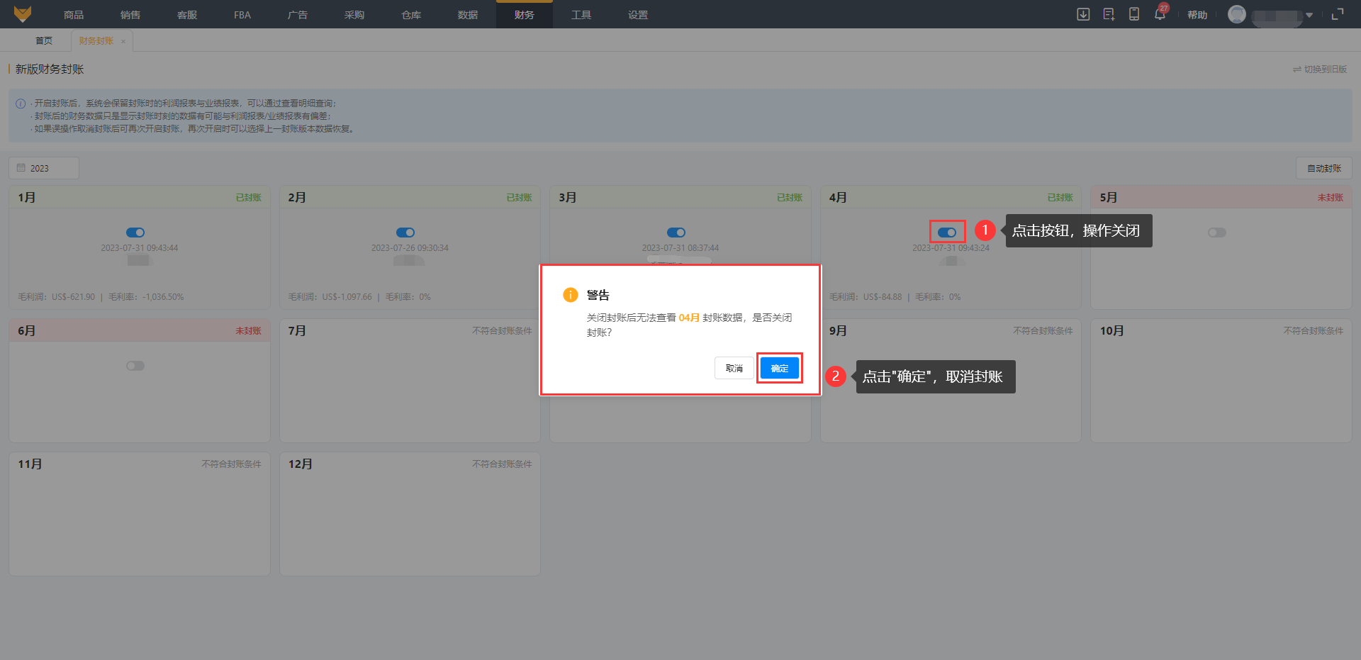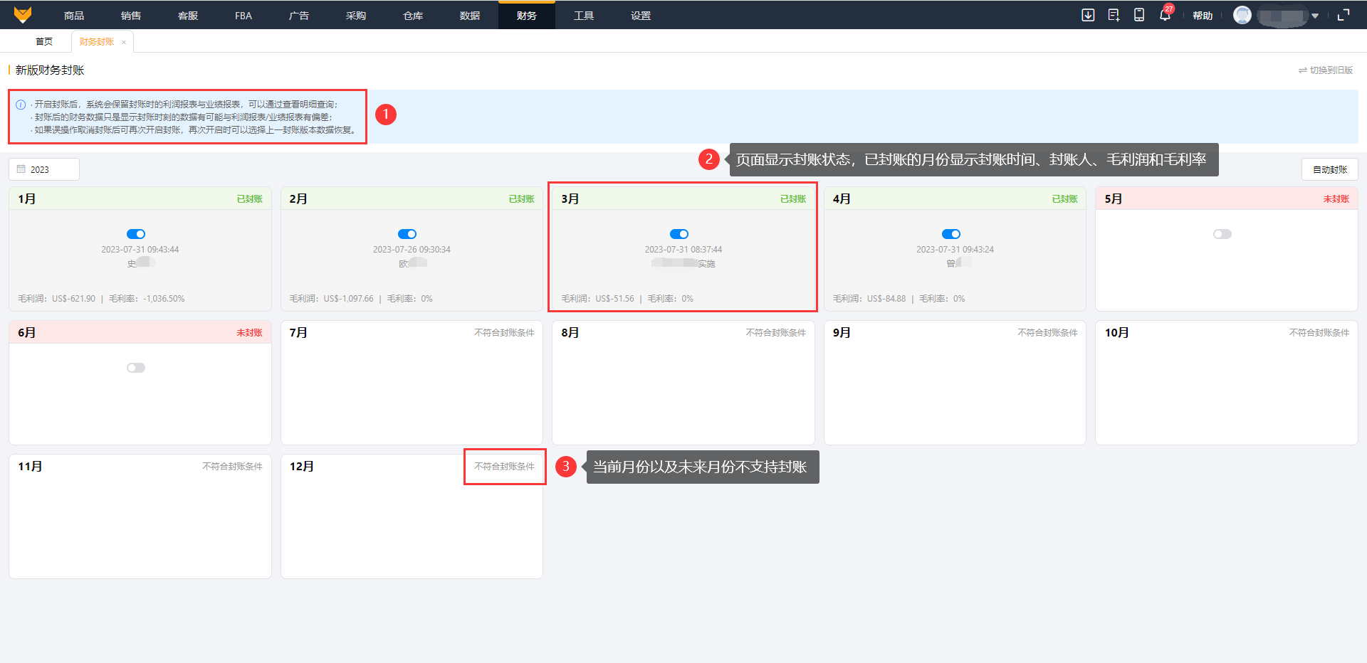 封账后页面能直观看到封账状态,已封账的月份显示封账时间、封账人、毛利润和毛利率;注意当前月份以及未来月份不支持操作封账。