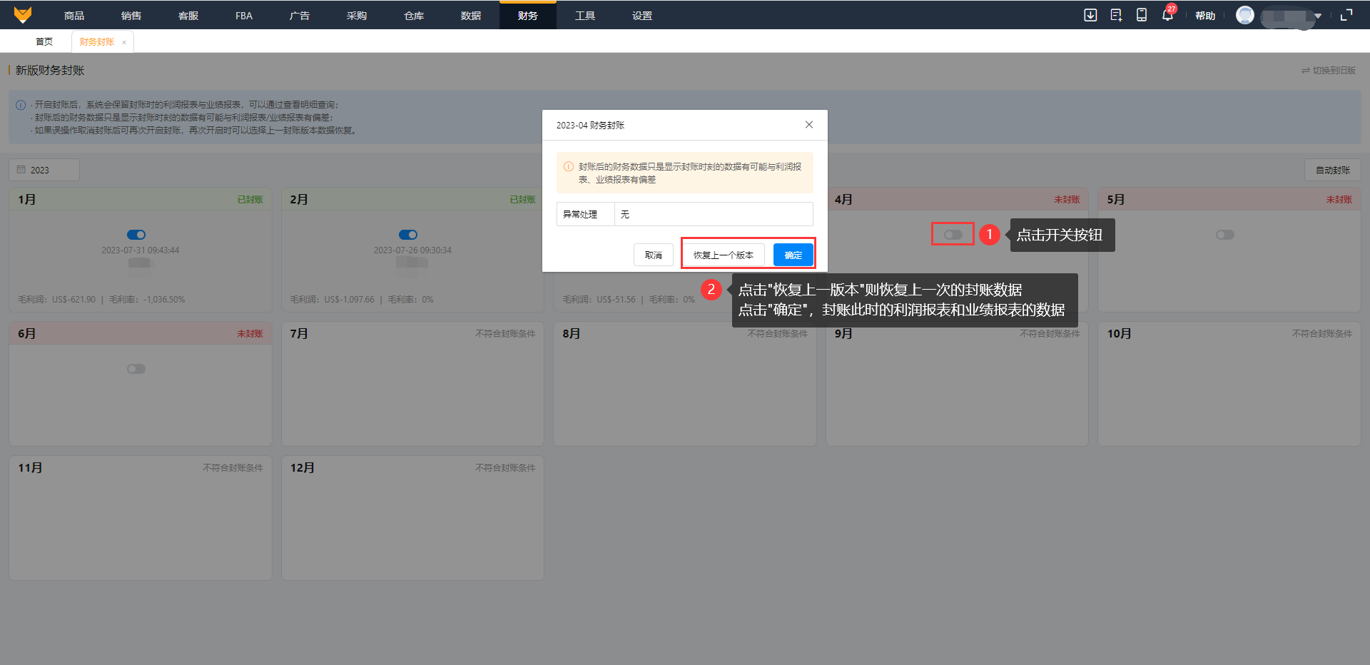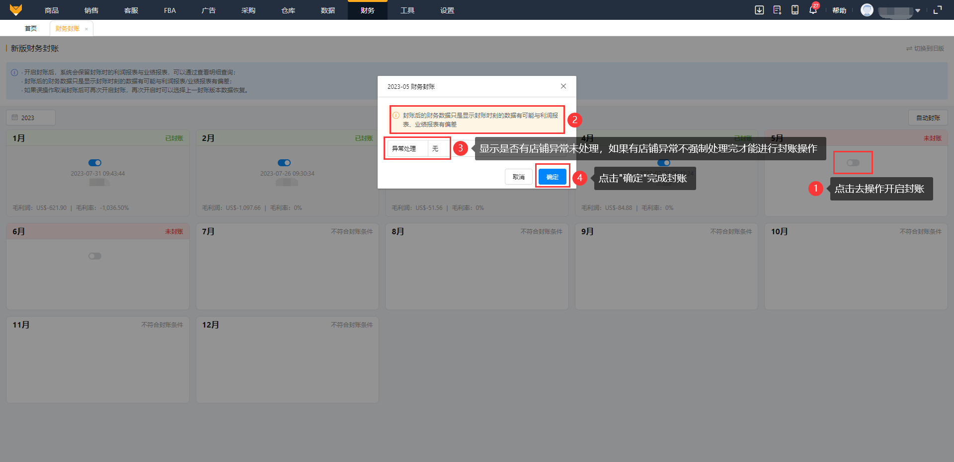 点击“开关”按钮,显示当前月份是否有店铺异常未处理,不强制处理店铺异常,点击确定即开启封账。