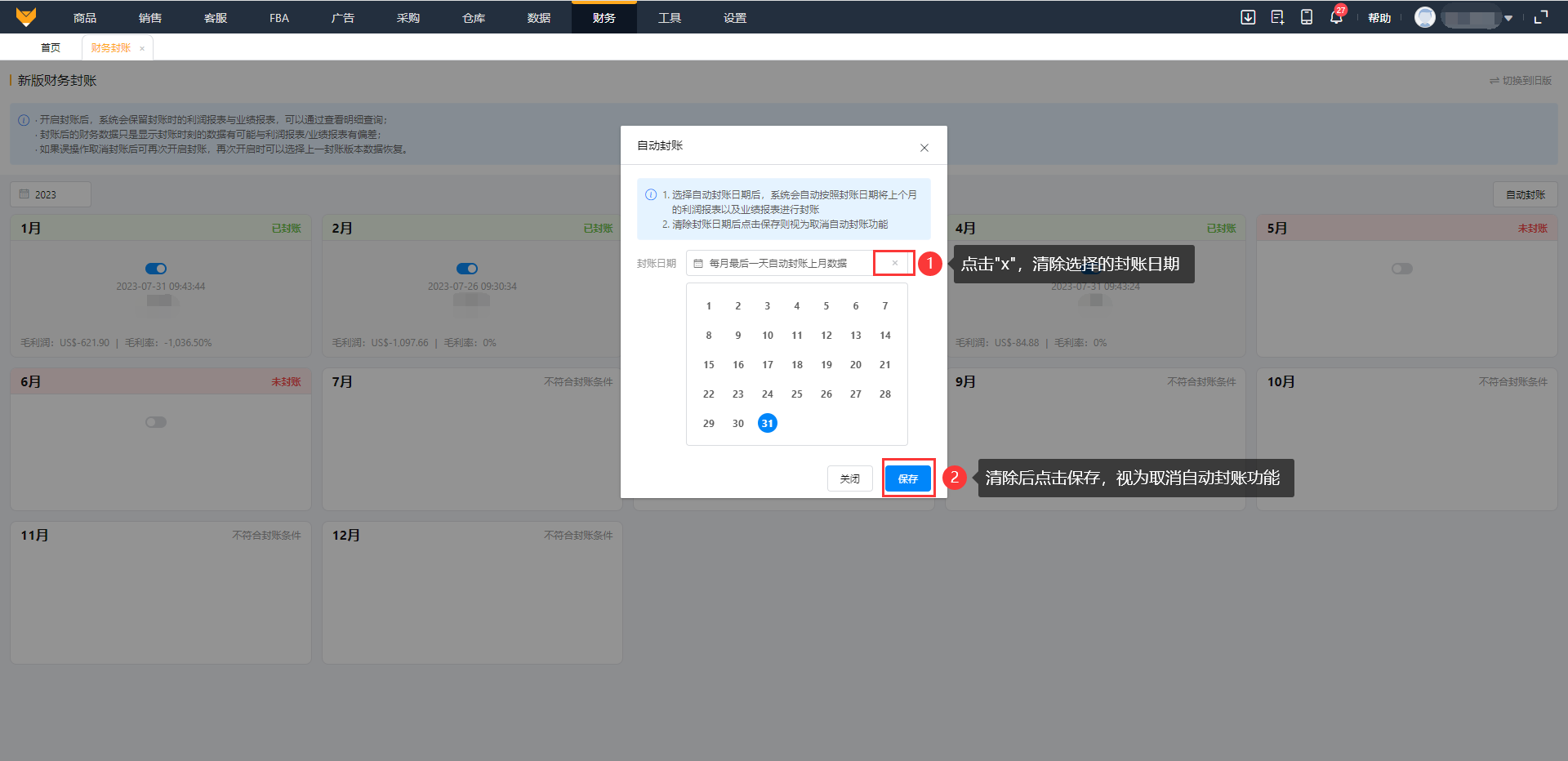 当清除封账日期后点击保存则视为取消自动封账功能。