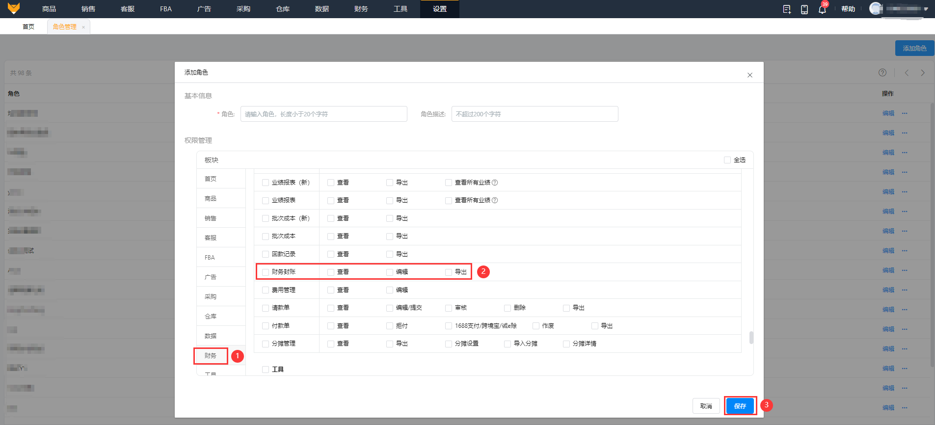 主账号需要给子账号分配权限,选择财务板块,勾选“财务封账”权限,确认后保存。