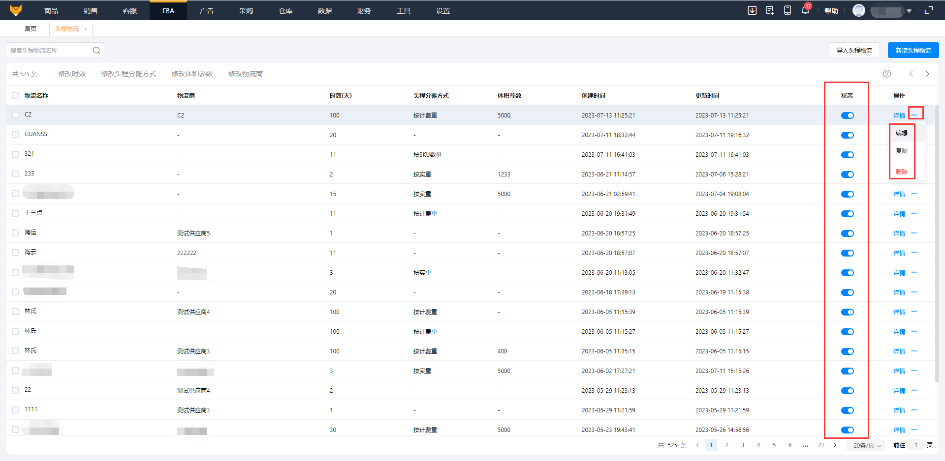 4.1头程物流设置好后,需保存并启用,支持编辑、复制和删除。