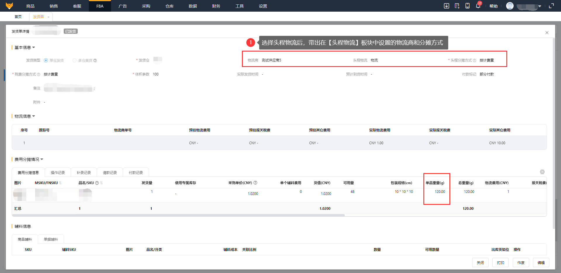 以【生成发货单】为例,在发货单中选择设置好的头程物流,带出物流商以及分摊方式,支持手动修改,再输入SKU重量即可算出对应的物流费用;若一个发货单有多个SKU,系统会自动计算SKU重量之和,再计算出对应的物流费用。