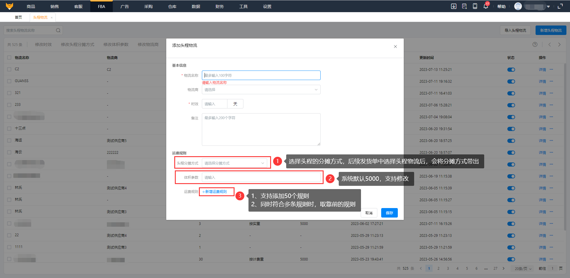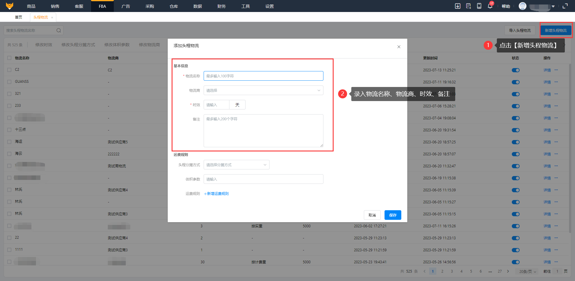 点击【新增头程物流】,填写基本信息,包括物流名称、物流商、时效、备注。