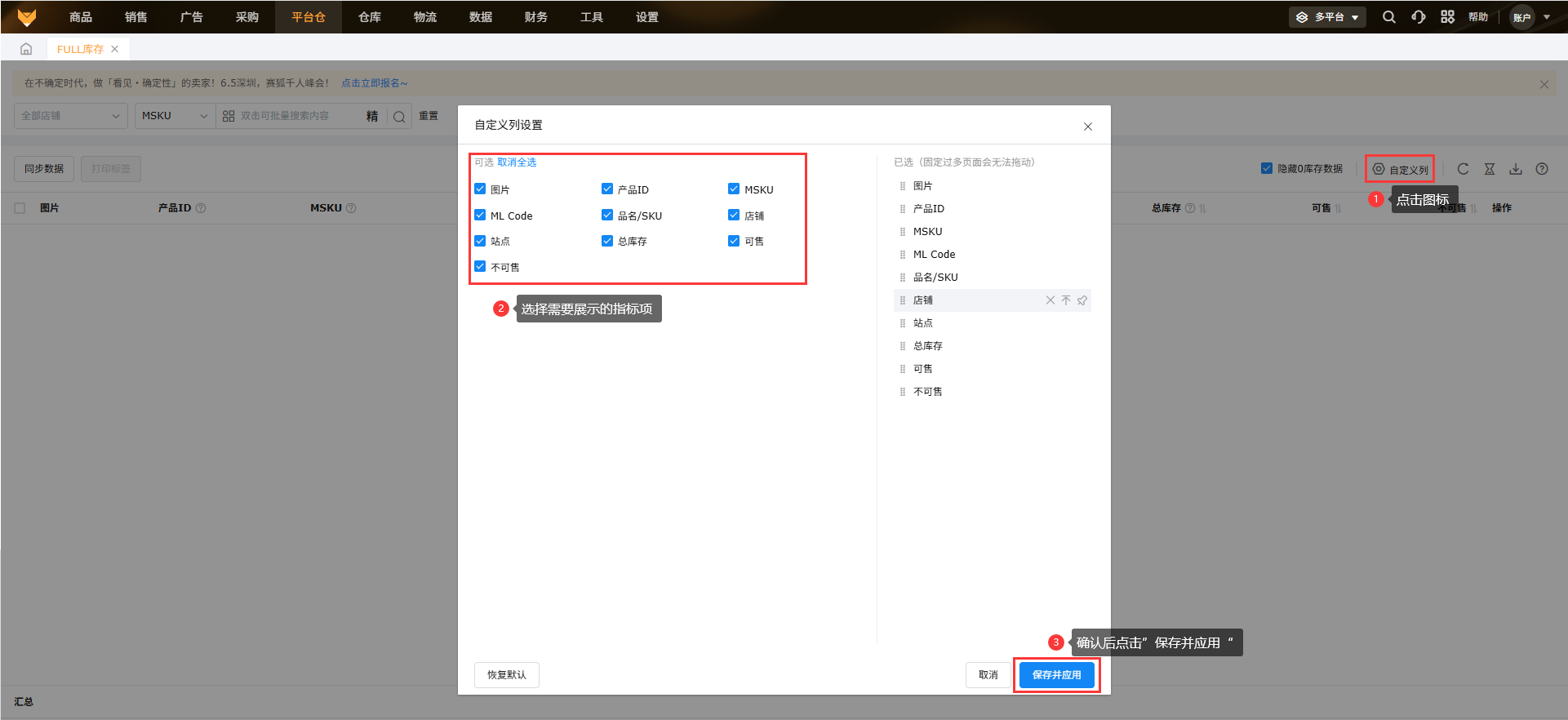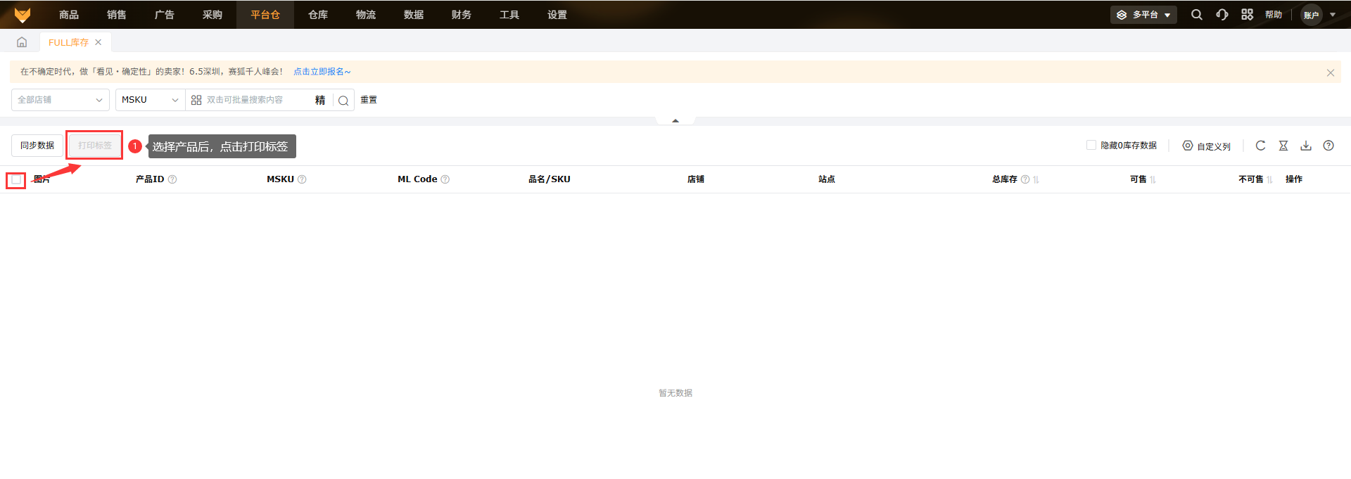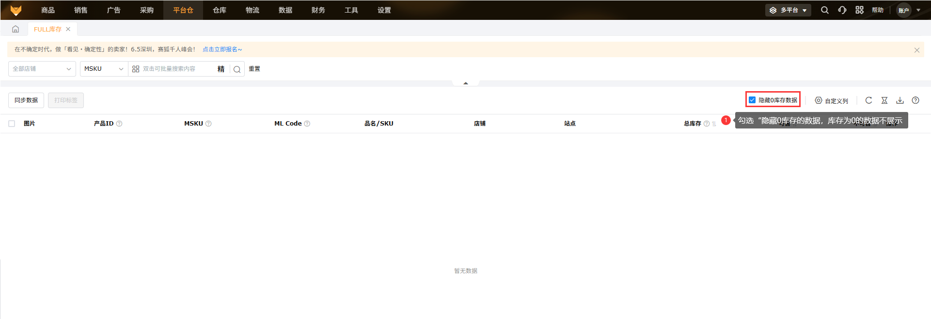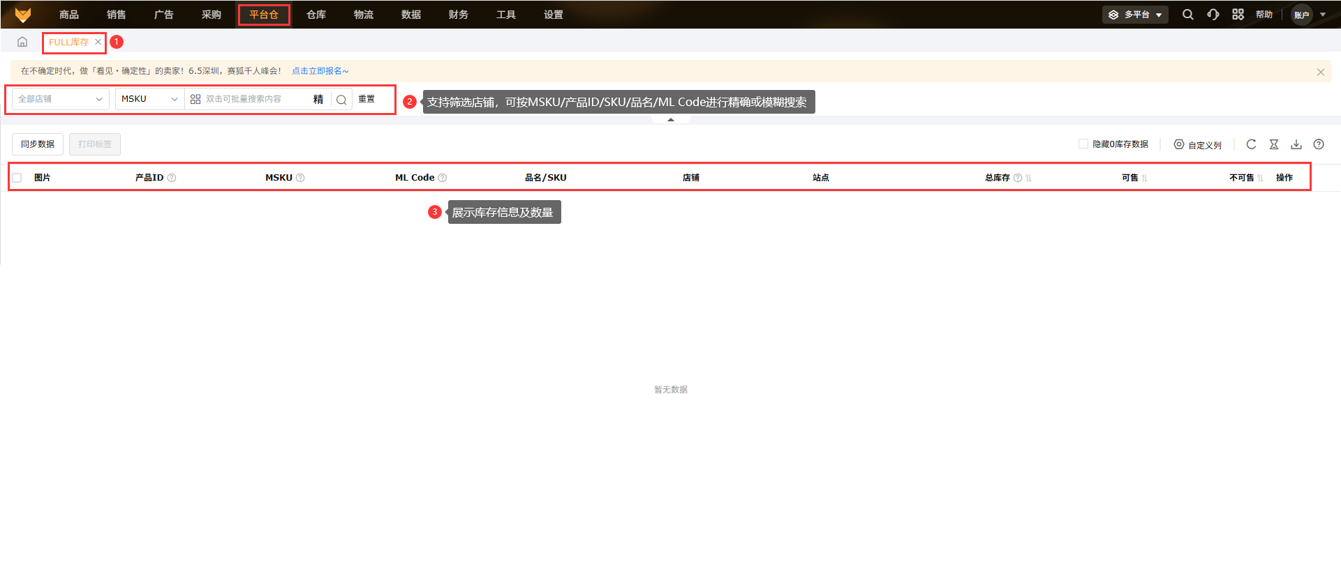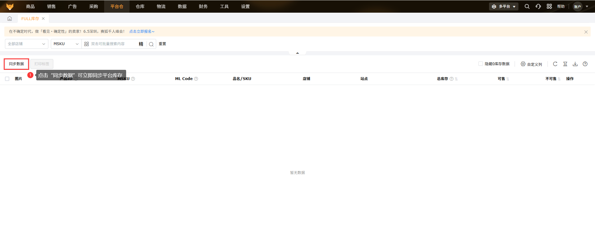 美客多本土店铺暂不支持FULL库存数据获取。