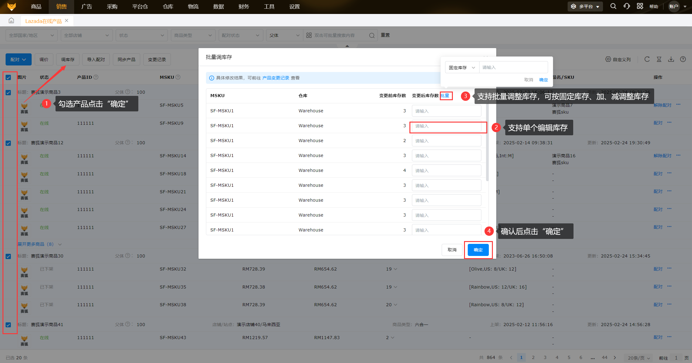 支持单个、批量调整库存,批量调库存可按固定库存、加、减库存调整。