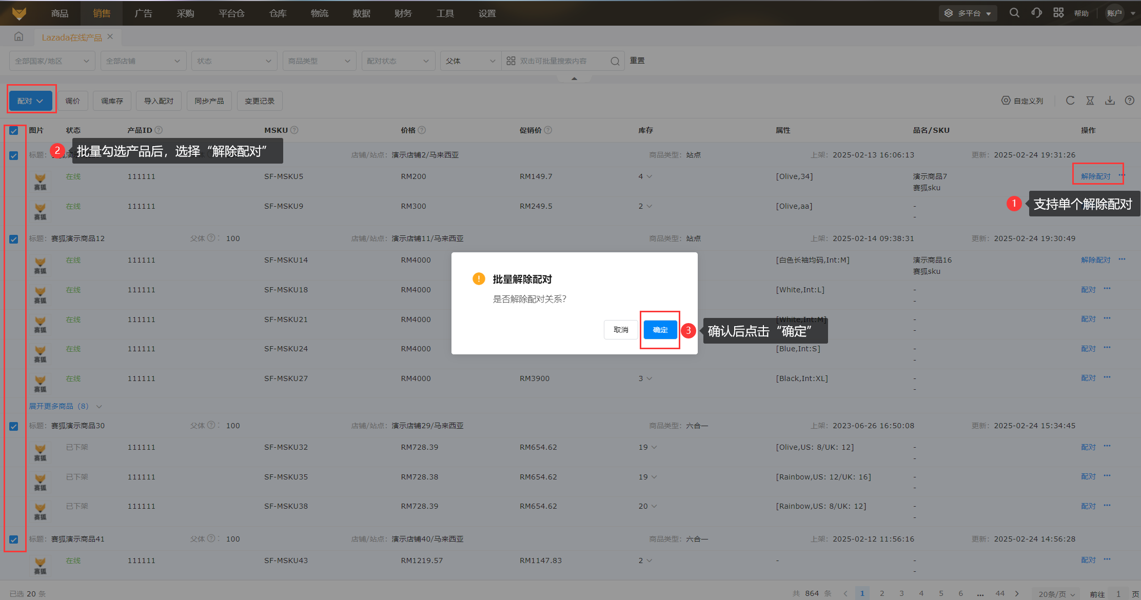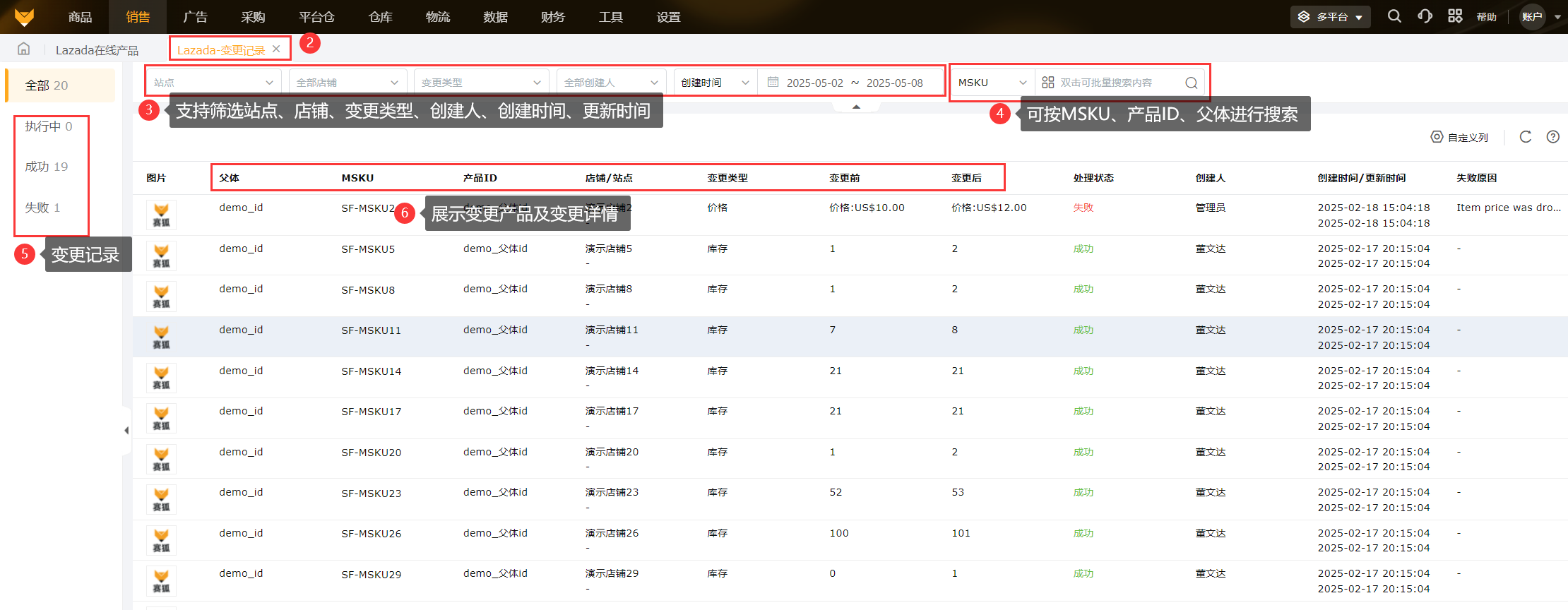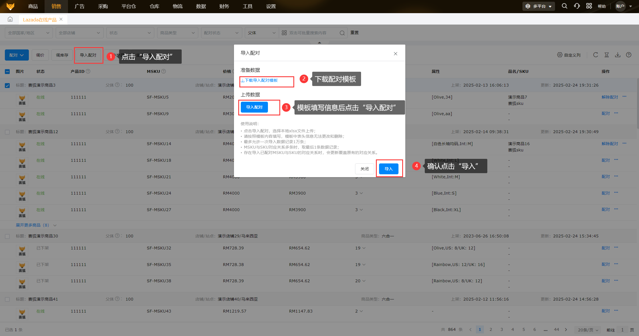 1、数据查看支持筛选国家/地区、店铺、产品状态、商品类型、配对状态,可按父体、MSKU、产品ID、SKU、品名、产品名称进行搜索。