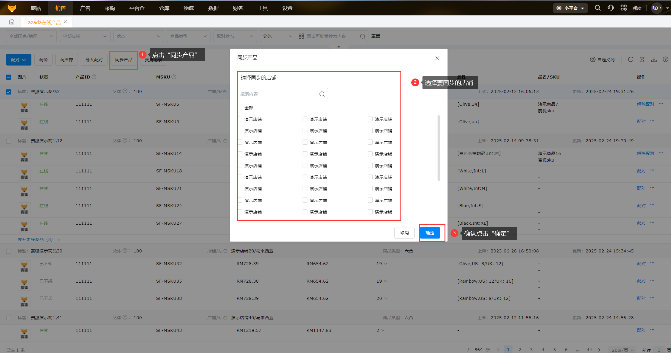 在系统完成授权店铺之后,在线产品页面会显示已授权店铺的产品MSKU、状态、价格、库存、属性等信息。