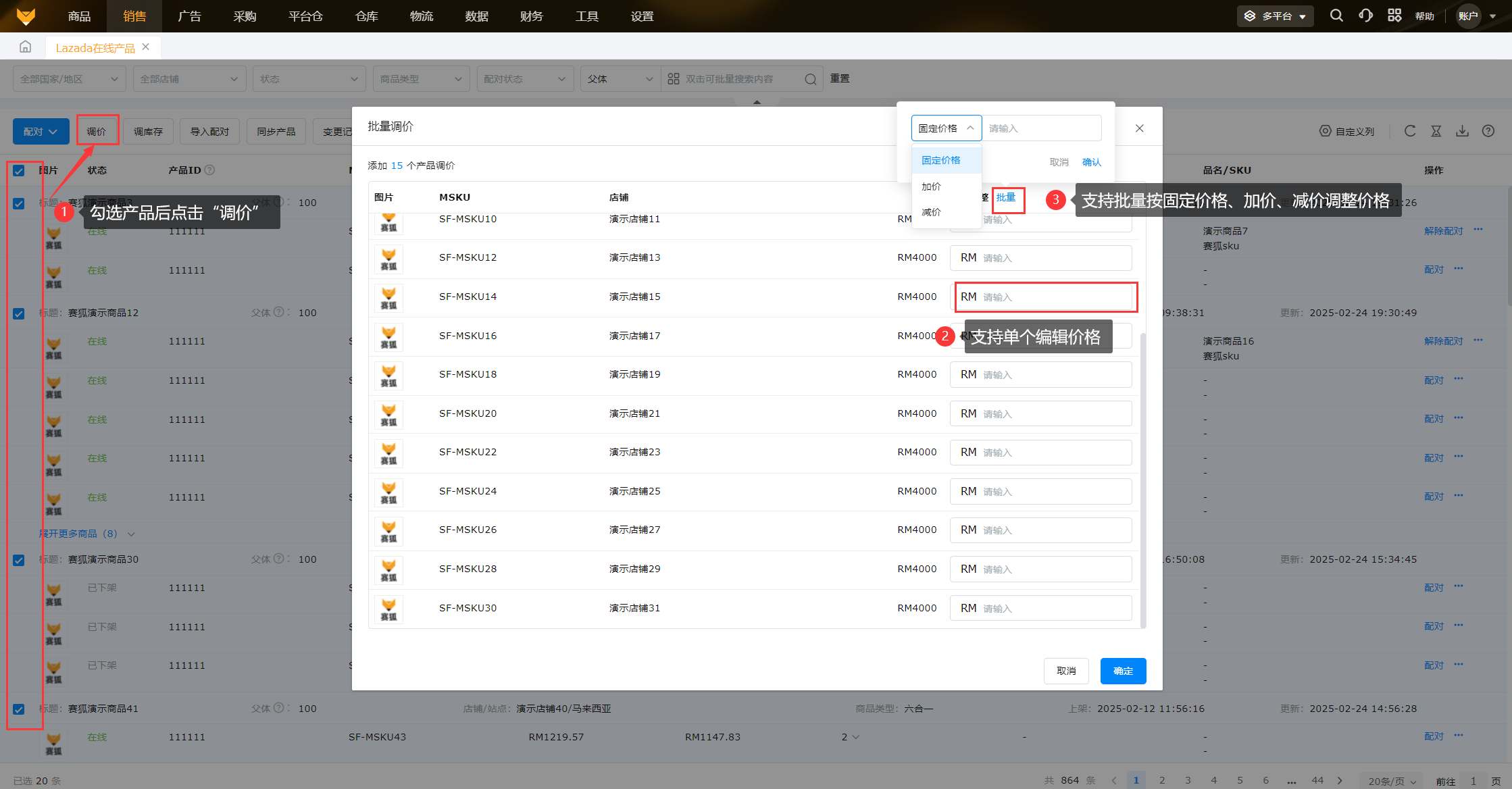 支持单个、批量调价,批量调价可选择按固定价格、加价、减价调整。