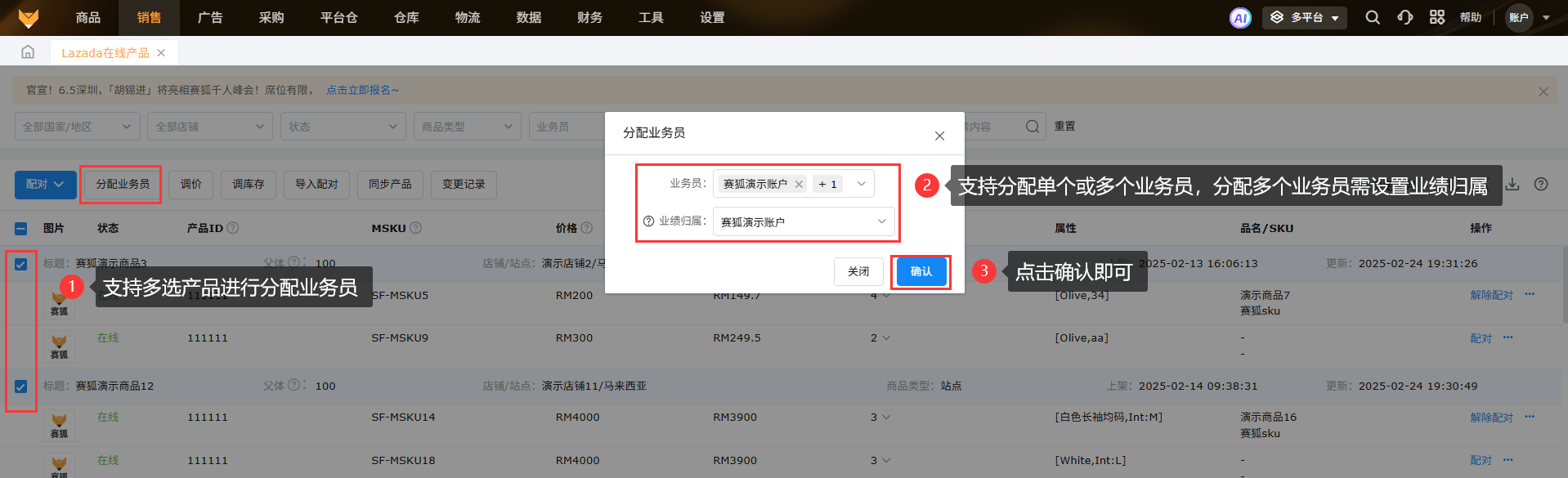 勾选产品,点击【分配业务员】;支持多选业务员,如果选择多个业务员,需选择业绩归属,如不选择则默认归属于第一个人;