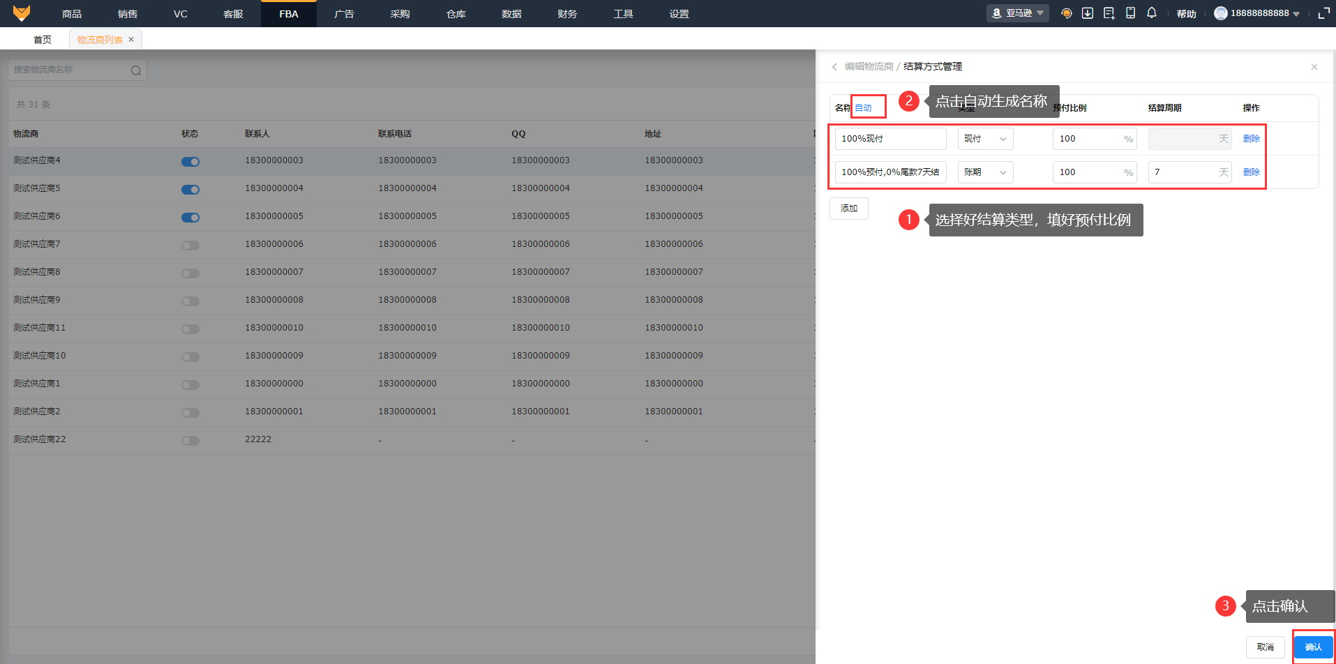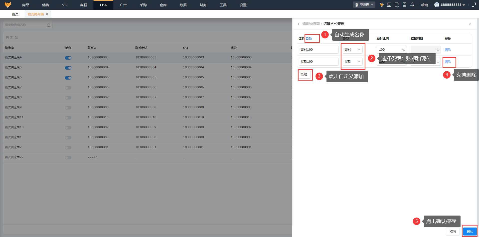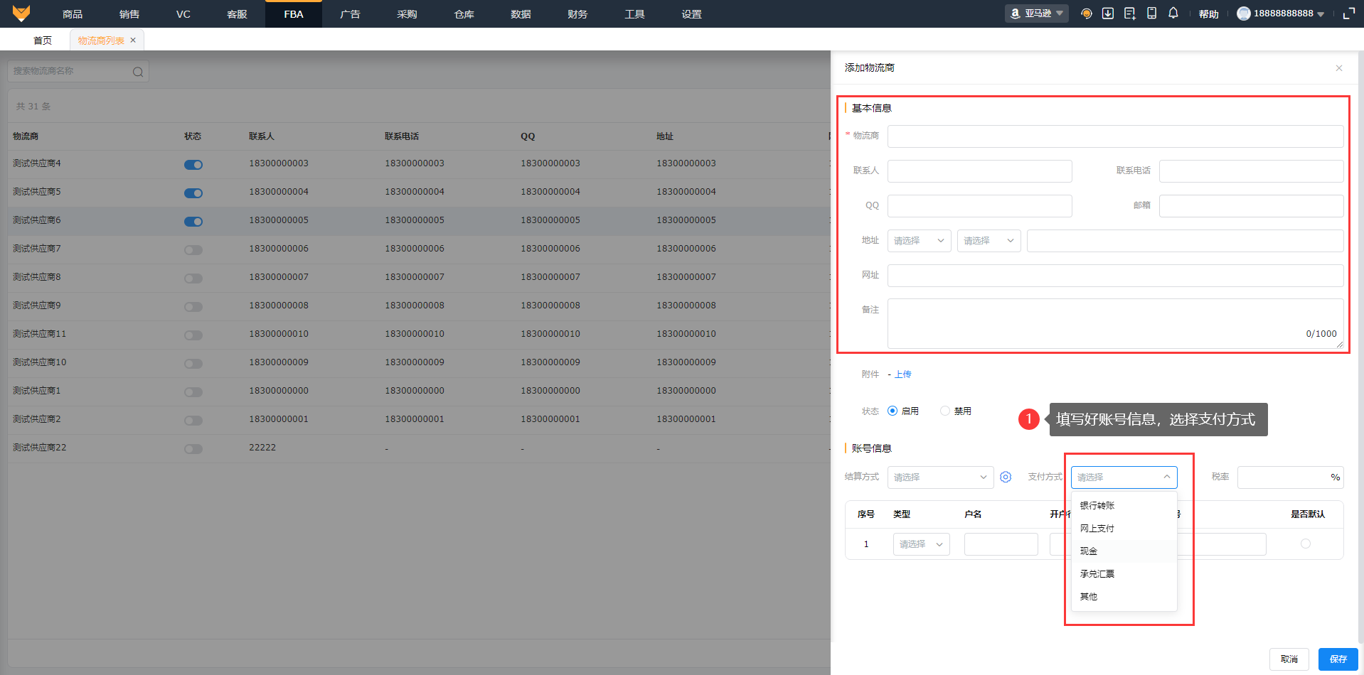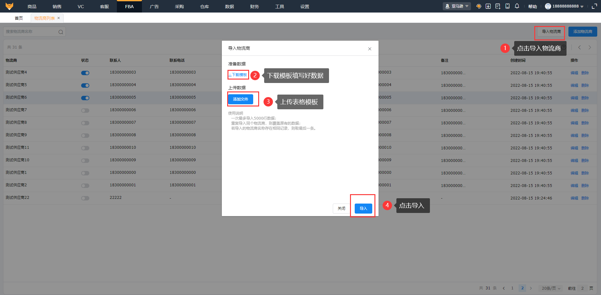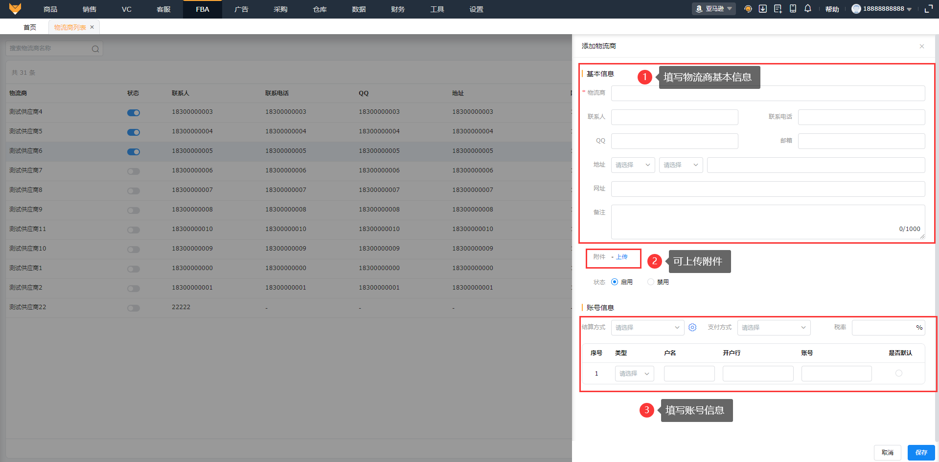 入口:【FBA】-【物流商列表】(1)点击“添加物流商”或者导入物流商添加,填写基本信息记录物流商,可上传附件,最多上传5个,支持上传zip格式的压缩文件。