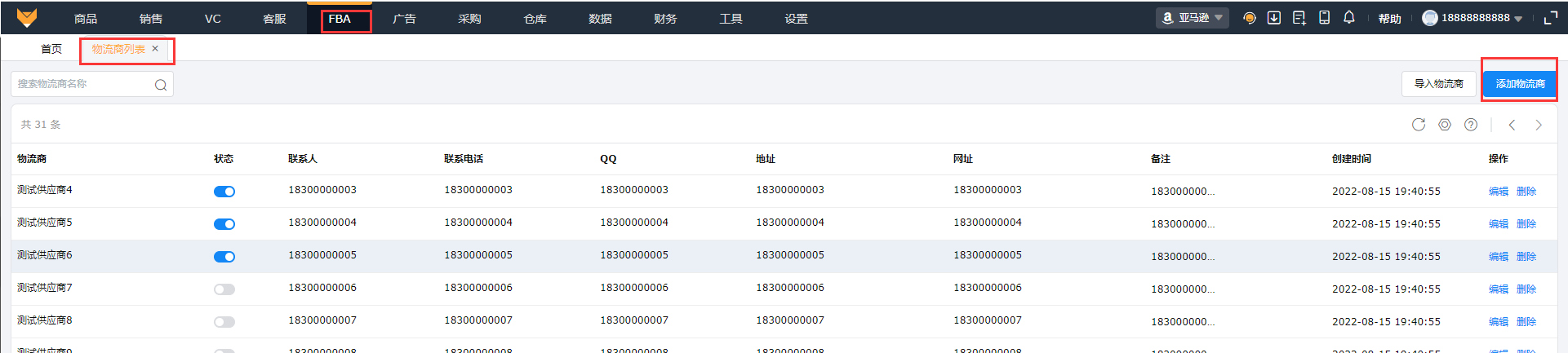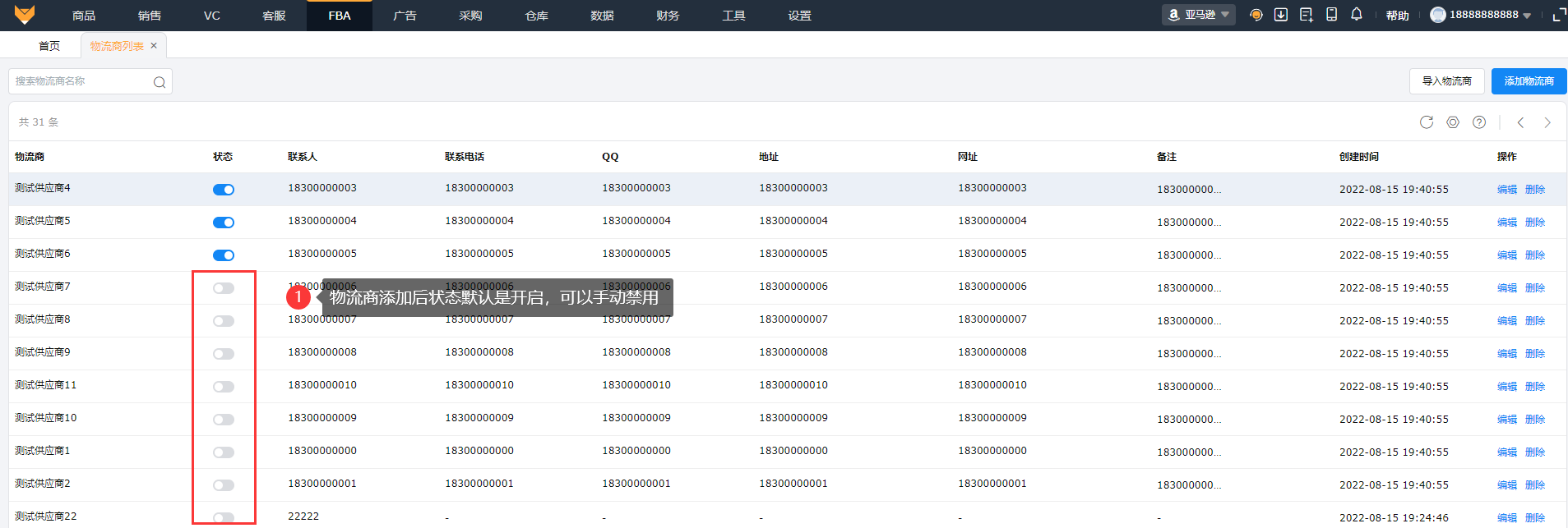 (3)添加的物流商状态默认是开启的,支持手动关闭状态,禁用对应物流商。