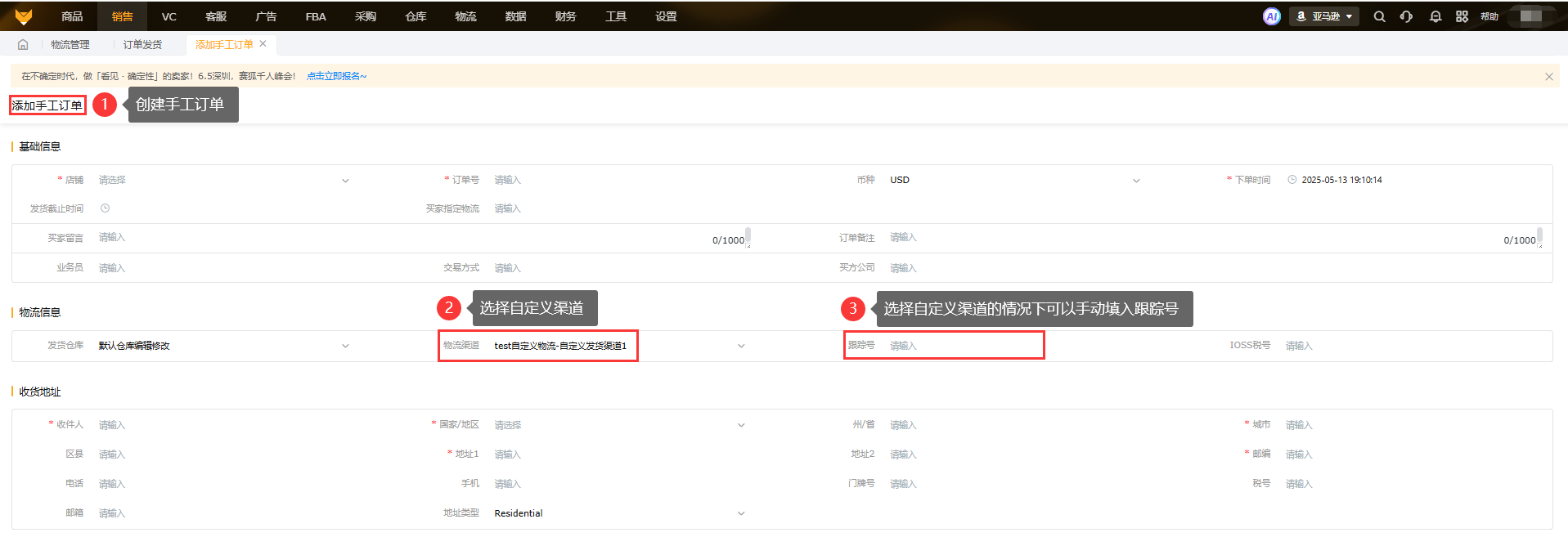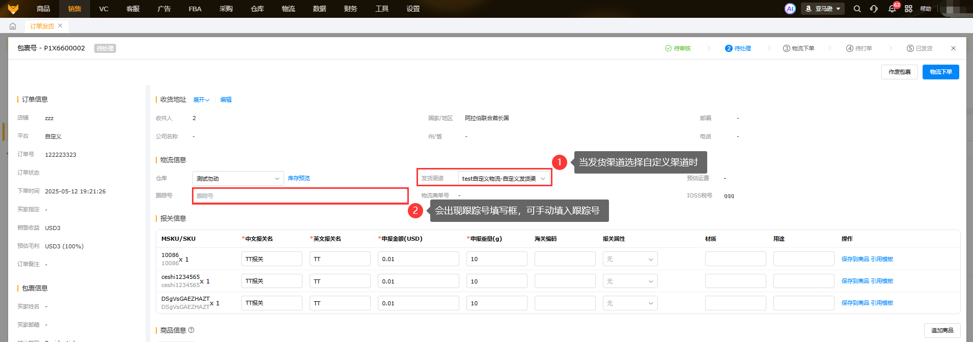 在订单发货页面,对处于待审核、待处理和物流下单-失败的状态的包裹,可以点击包裹详情选择自定义渠道,以及创建补发包裹、添加手工单的弹窗中选择自定义渠道后可以手动输入跟踪号字段。