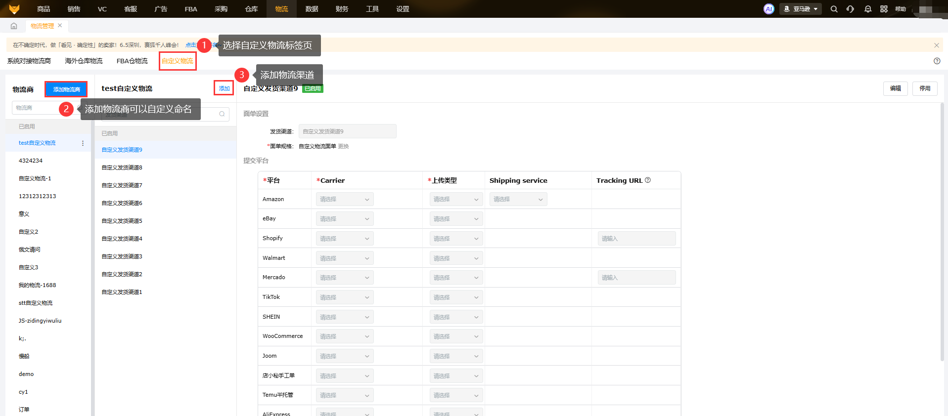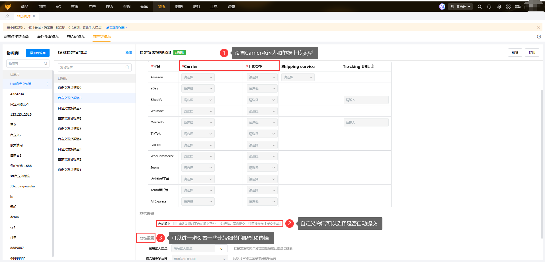 配置自定义物流渠道。