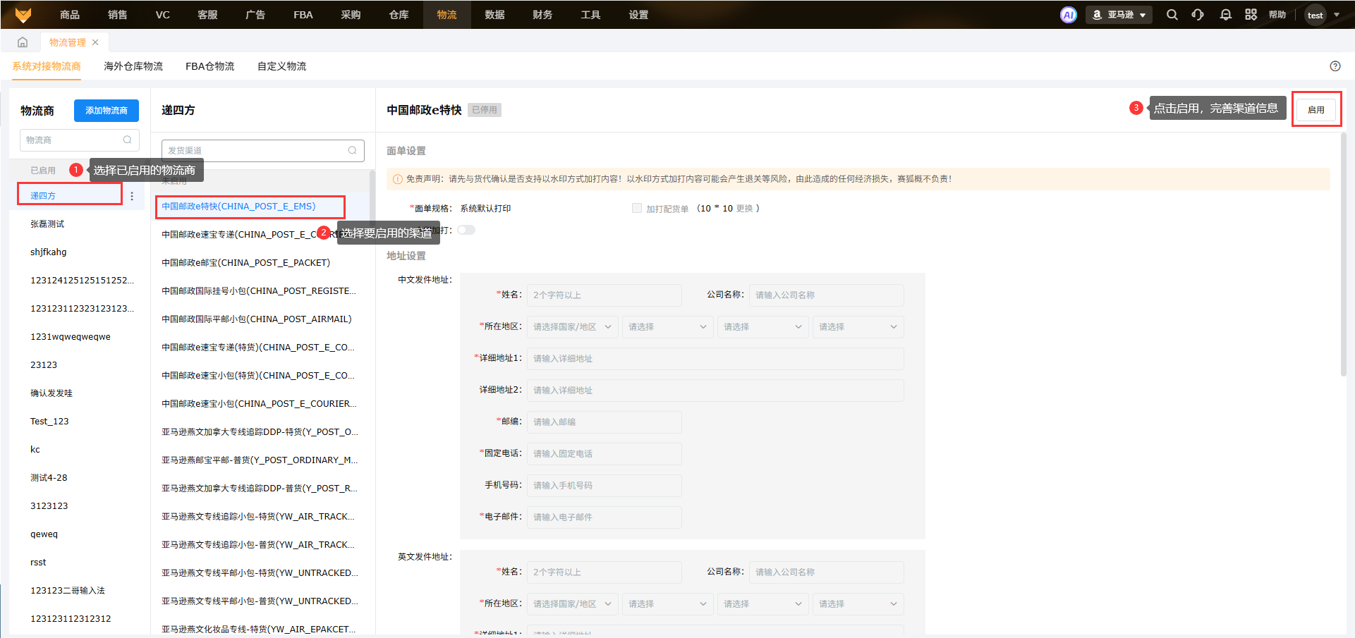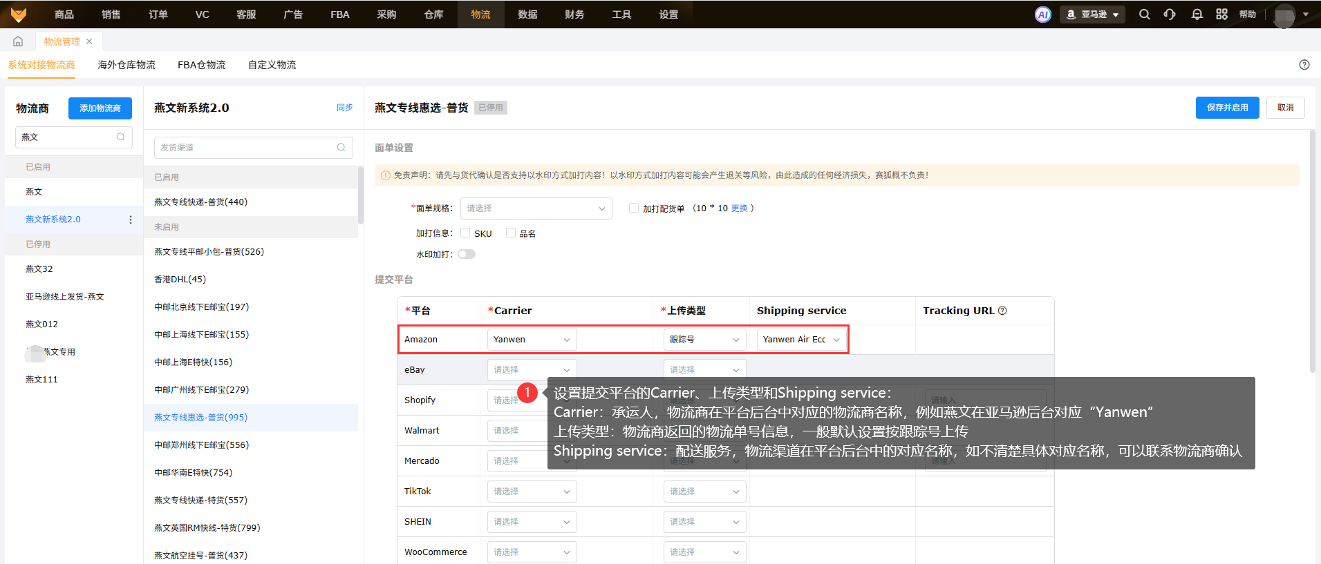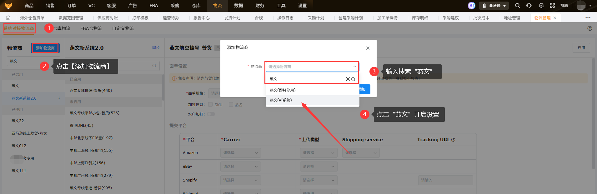 1.3 以燕文物流商为例,在系统如何开启渠道使用: