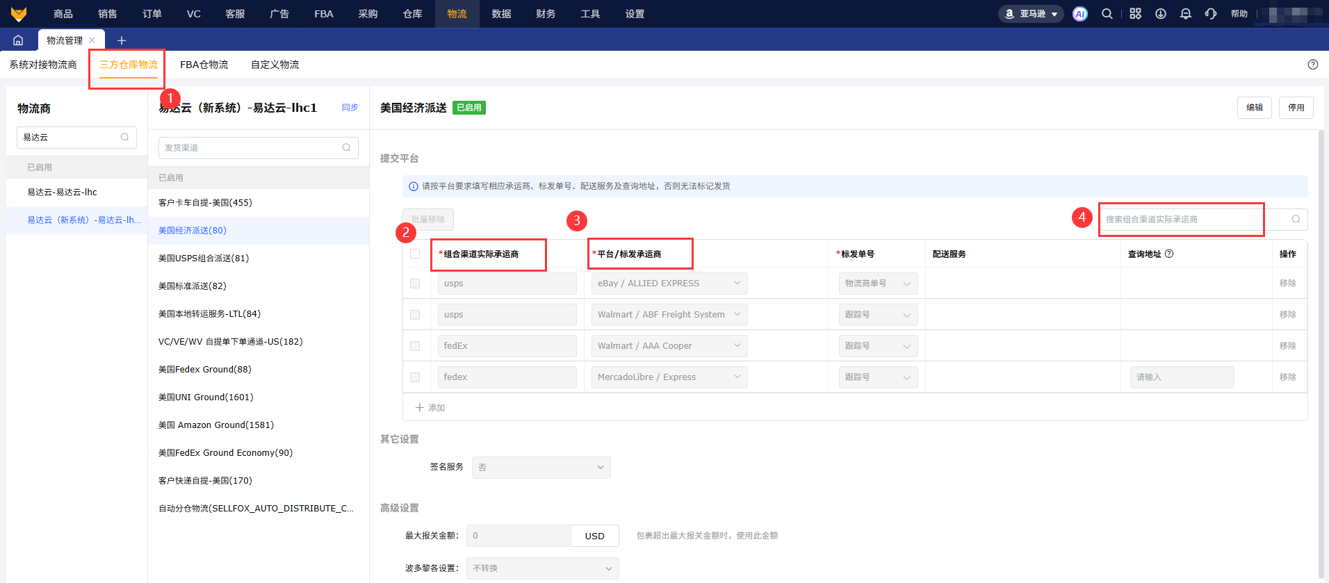 系统在【物流设置】里提交亚马逊可以筛选要发的承运人和配送服务渠道,没有搜索到的名称,支持“other”自定义填写渠道,内容不能超过100字符。