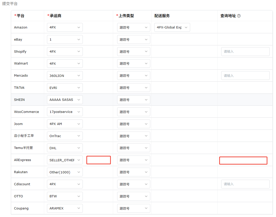 提交平台就是设置当订单使用燕文发货时,物流单号信息上传到对应平台发货时,需要上传的信息;
