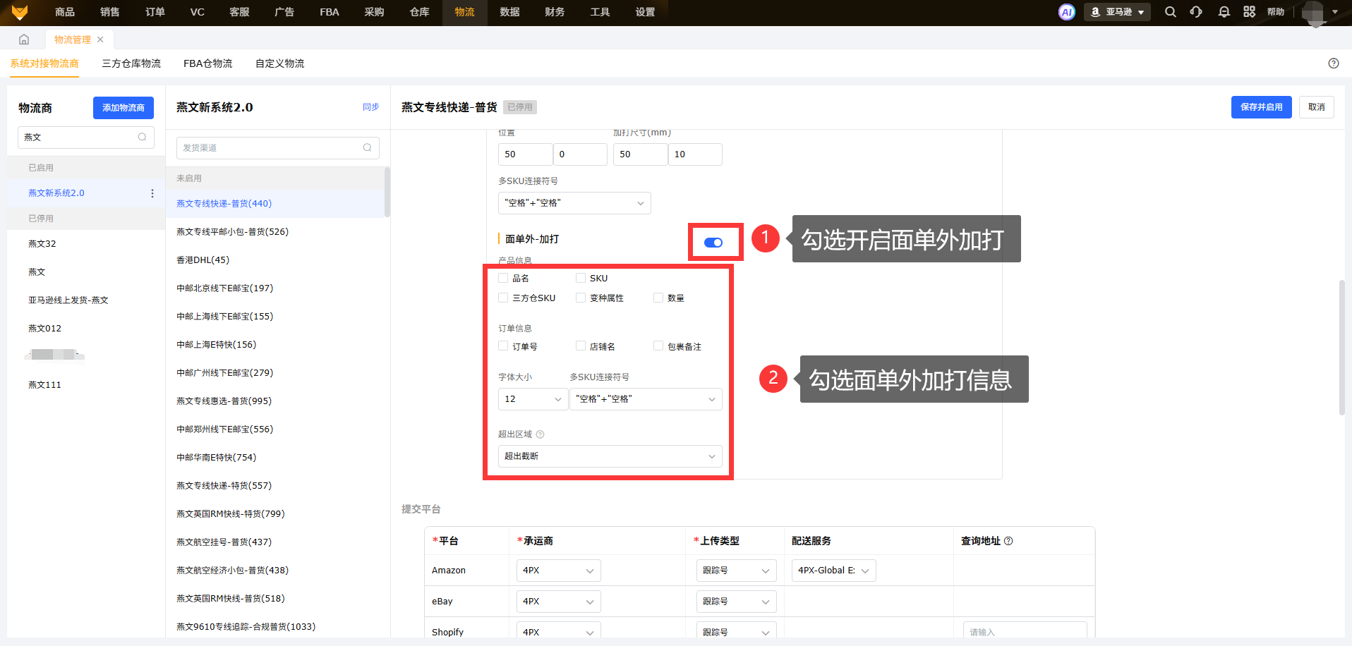 注:勾选加打SKU和品名需要在物流下单前进行设置,如在物流下单后设置同样不显示加打SKU和加打品名;