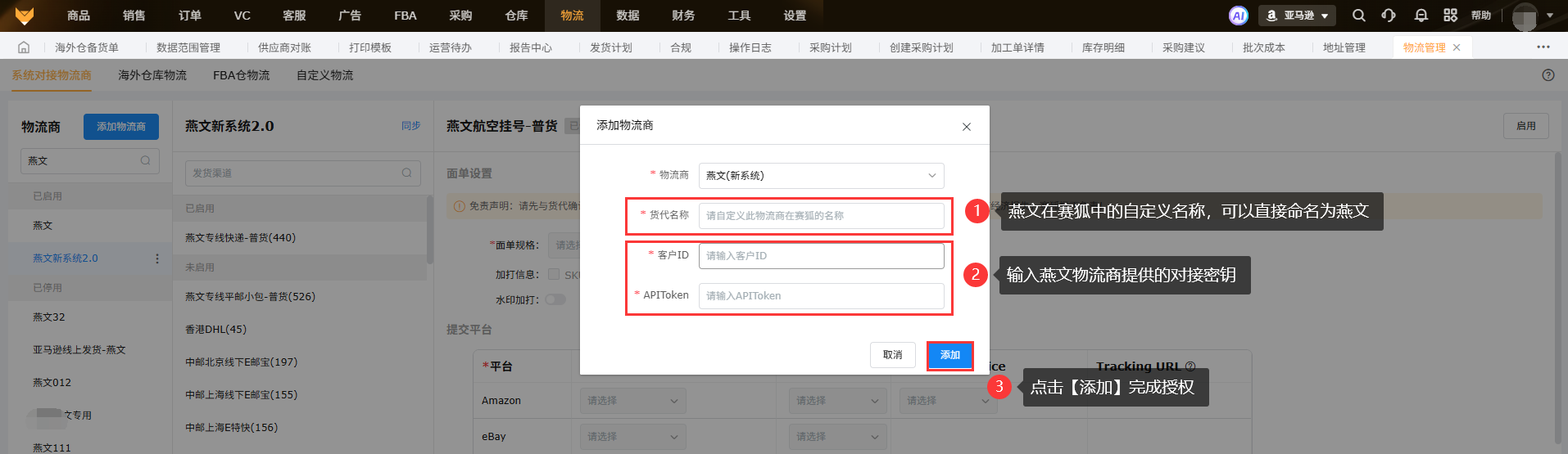 (1)切换到【系统对接物流商】页面,点击【添加物流商】,在添加物流商的页面中输入“燕文”对接授权,在对接物流商的详情页面中,货代名称就是这个物流商在赛狐系统的名称,支持自定义,可以直接命名为燕文;客户ID和APIToken需要联系燕文获取;