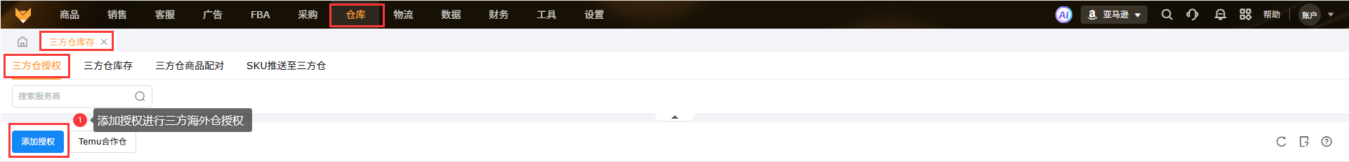 2.1 需要先到【仓库】-【三方仓库】进行三方海外仓授权;