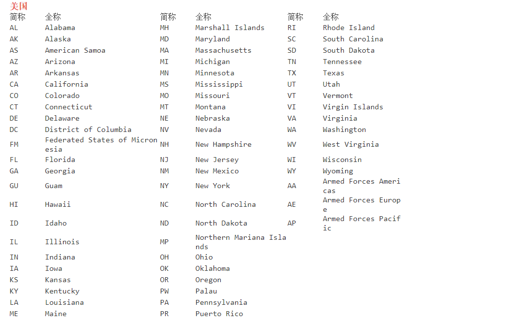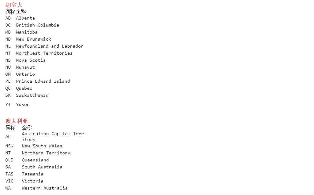 美国、加拿大、澳大利亚的州省全称和简称转换,不区分大小写,全称、简称在系统匹配时会去掉中间和前后空格,特殊字符不处理。