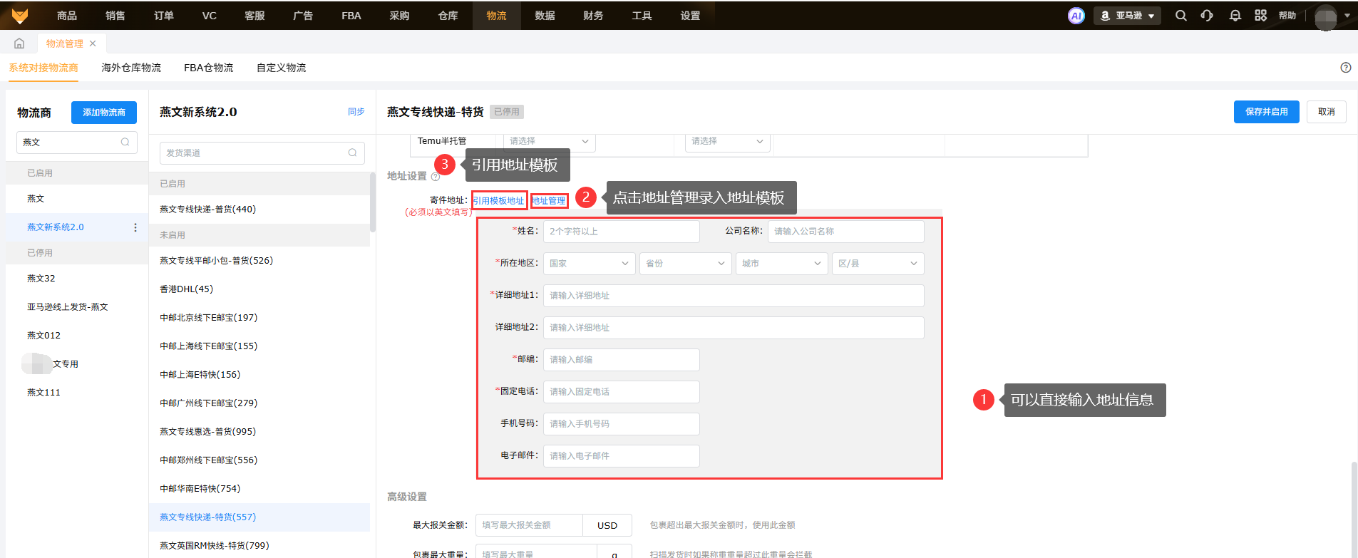 使用燕文物流商发货时,物流商揽收货物的地址;可以页面手动编辑,也可以点击地址管理,在地址管理中保存成模板,下次其他物流渠道要开启,就可以通过引用模板地址,直接带出地址信息