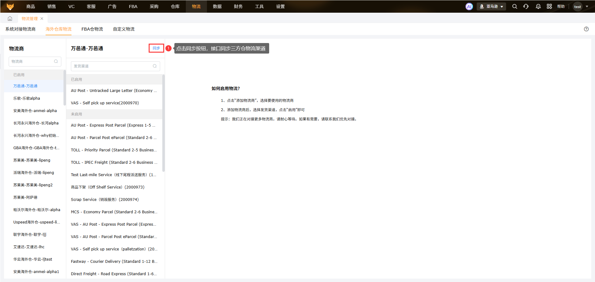 如果有的物流渠道搜索不到,【系统对接物流商】和【海外仓物流】中的物流渠道可以点击同步,接口会同步物流商或三方仓的物流渠道,同步到新的物流渠道后再开启设置。