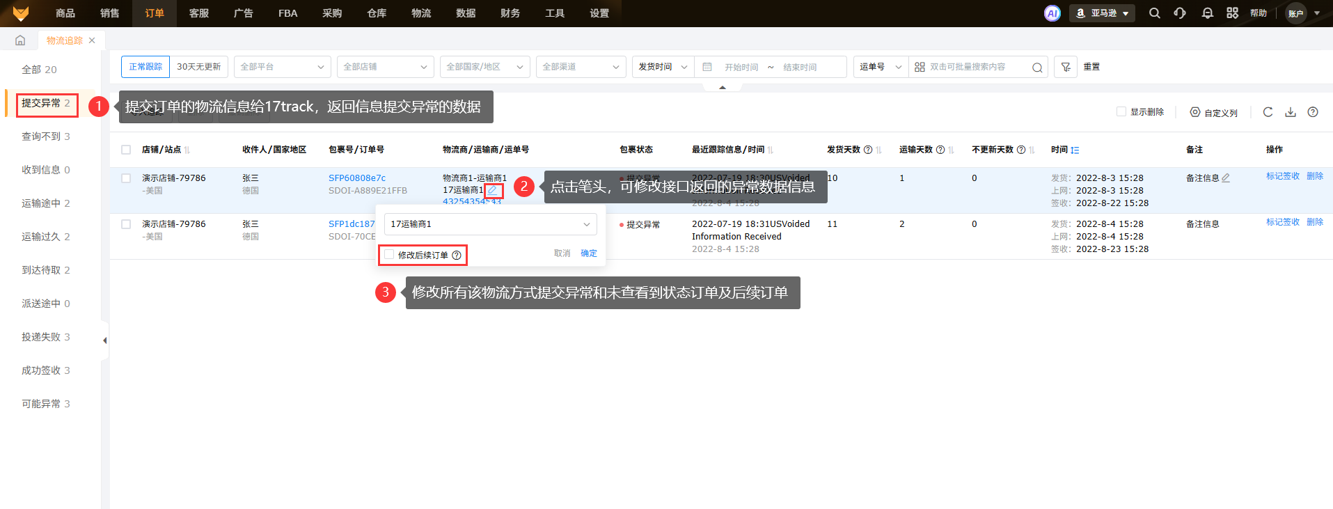 1.1 左侧列表栏中,“提交异常”表示把物流商和运单号提交给17track后,接口返回提交数据有异常,可以根据返回的情况去修改上传的信息。